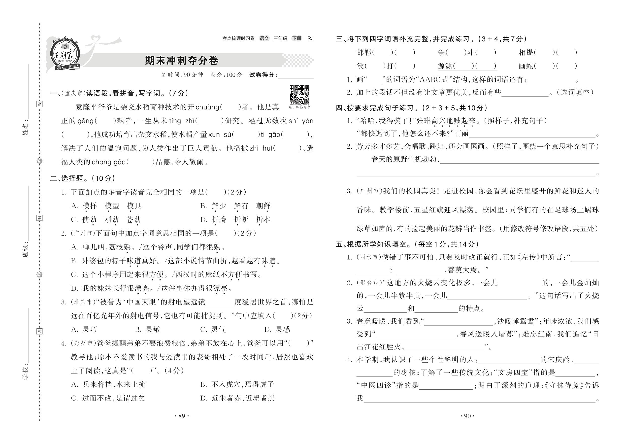 2022下册三年级语文人教版 期末冲刺夺分卷