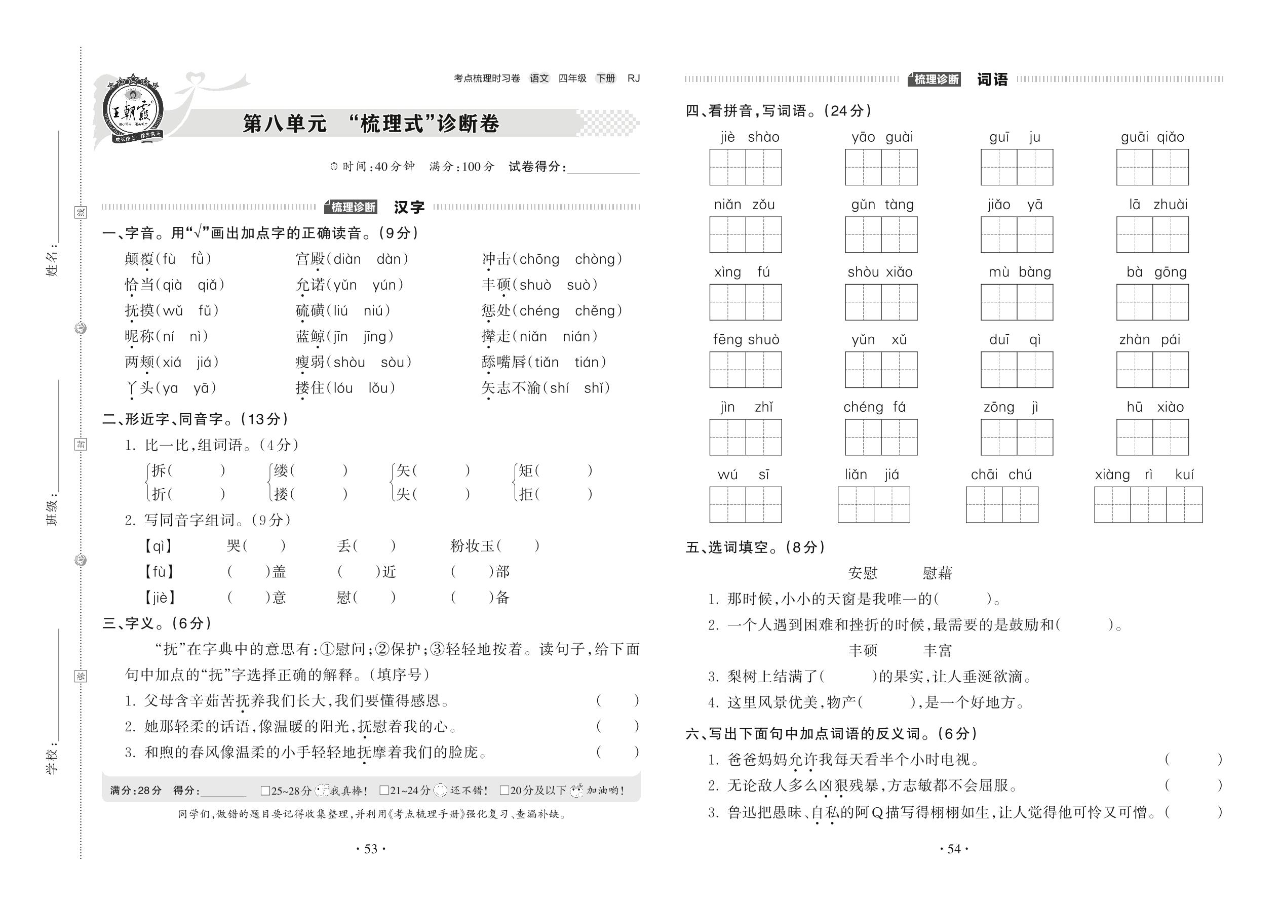 2022下册四年级语文人教版 第八单元 “梳理式”诊断卷