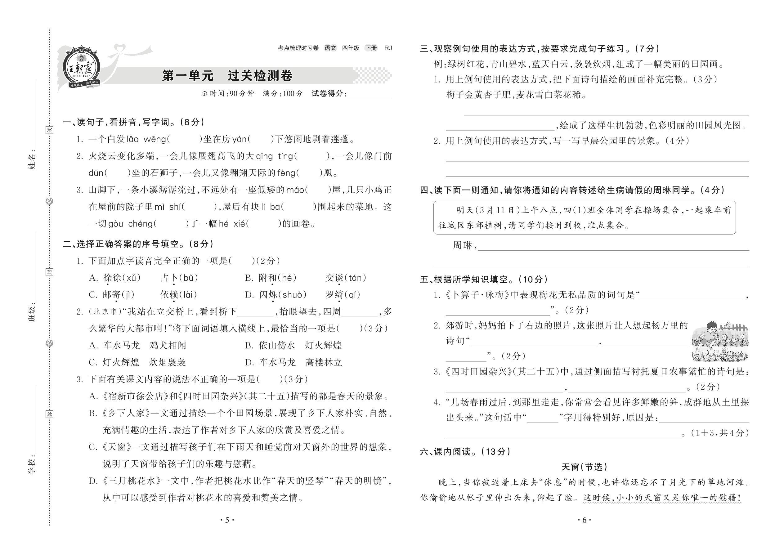 2022下册四年级语文人教版 第一单元 过关检测卷