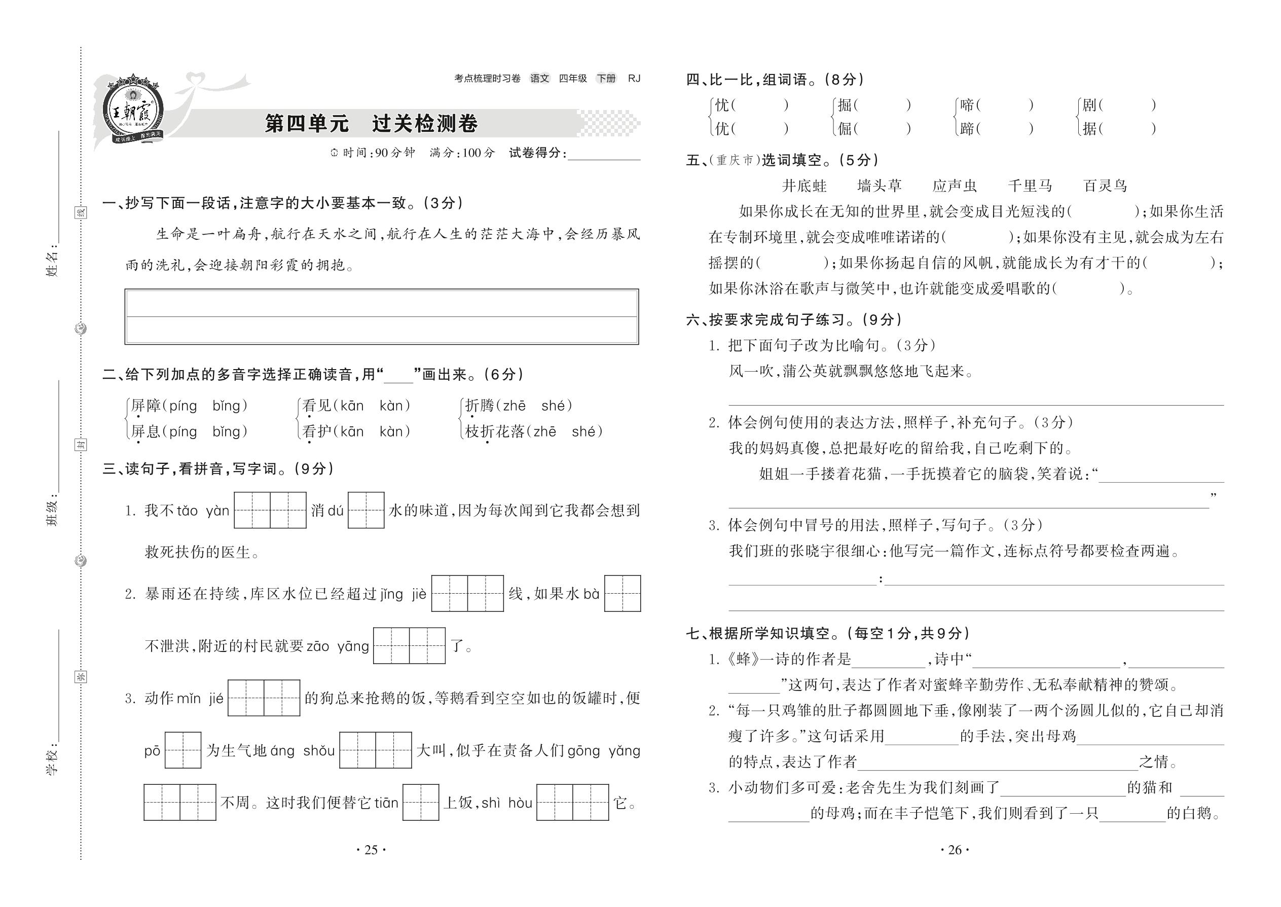 2022下册四年级语文人教版 第四单元 过关检测卷