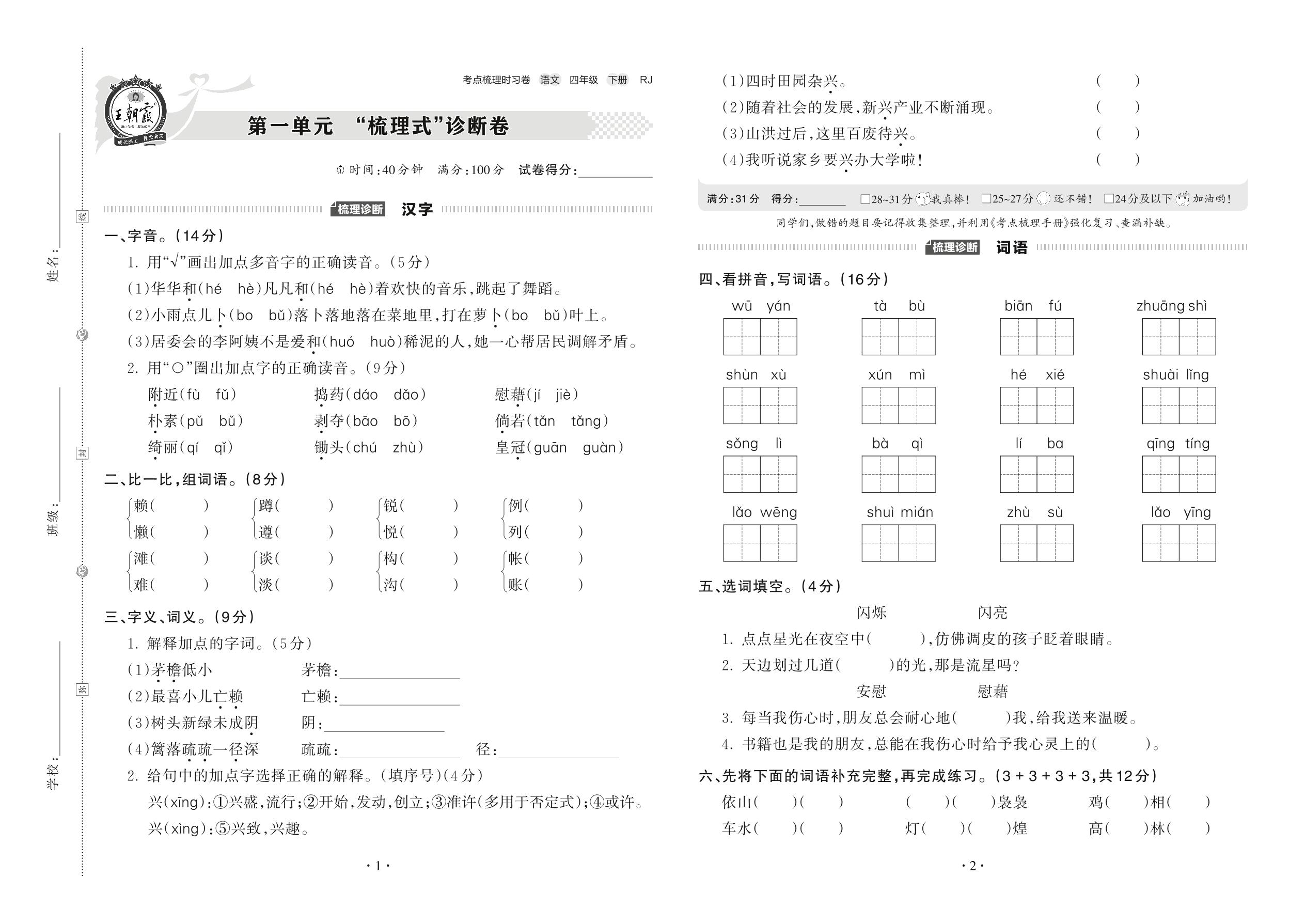 2022下册四年级语文人教版 第一单元 “梳理式”诊断卷