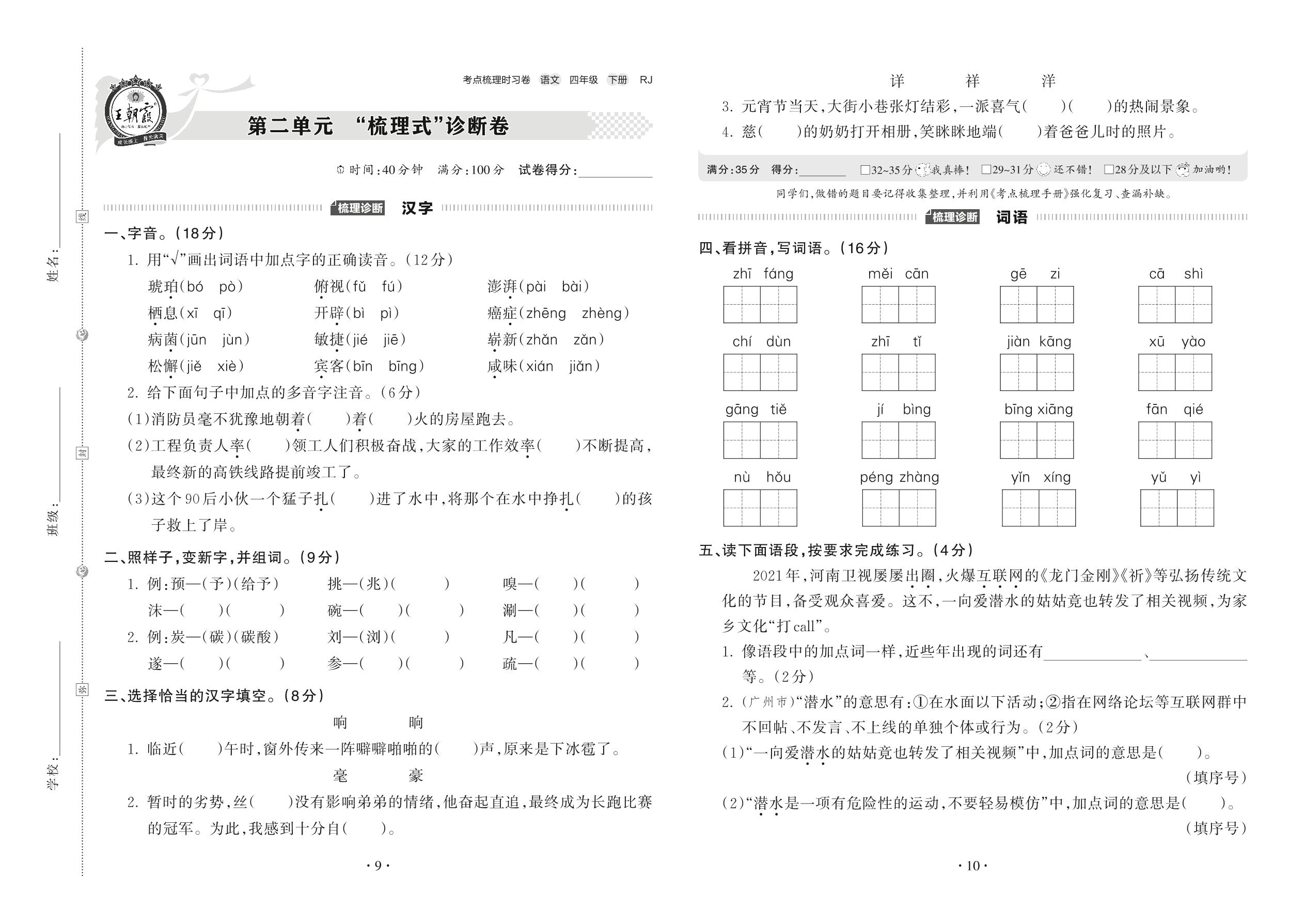 2022下册四年级语文人教版 第二单元 “梳理式”诊断卷