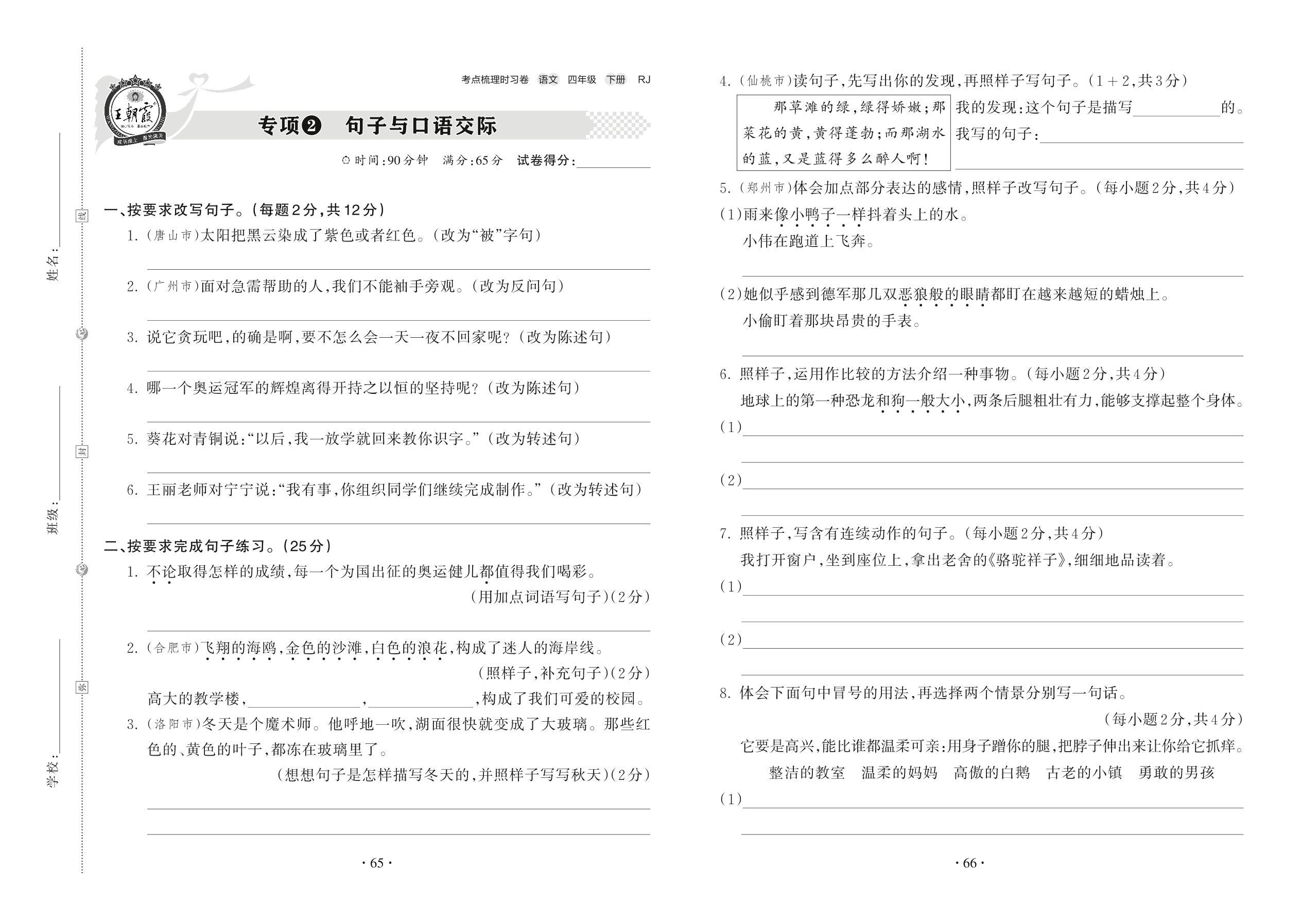 2022下册四年级语文人教版 专项2 句子与口语交际