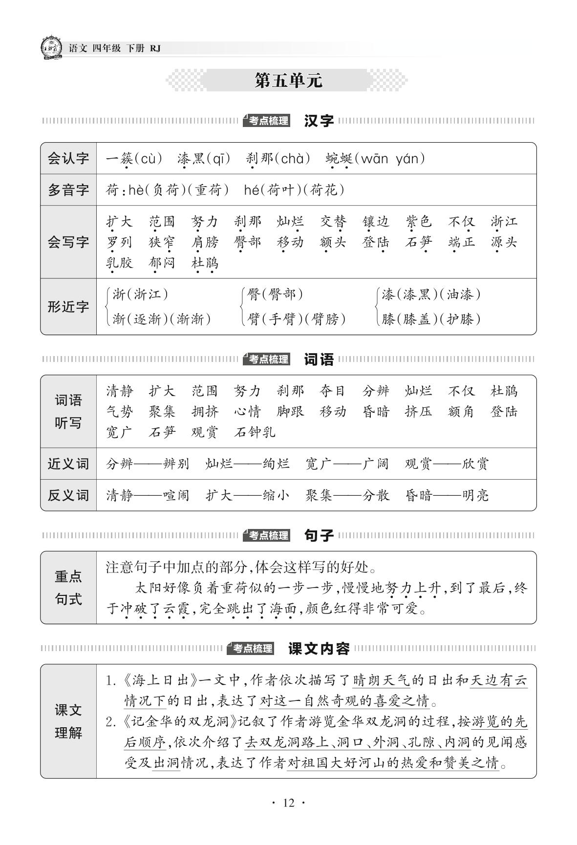 2022下册四年级语文人教版 考点梳理手册——第五单元