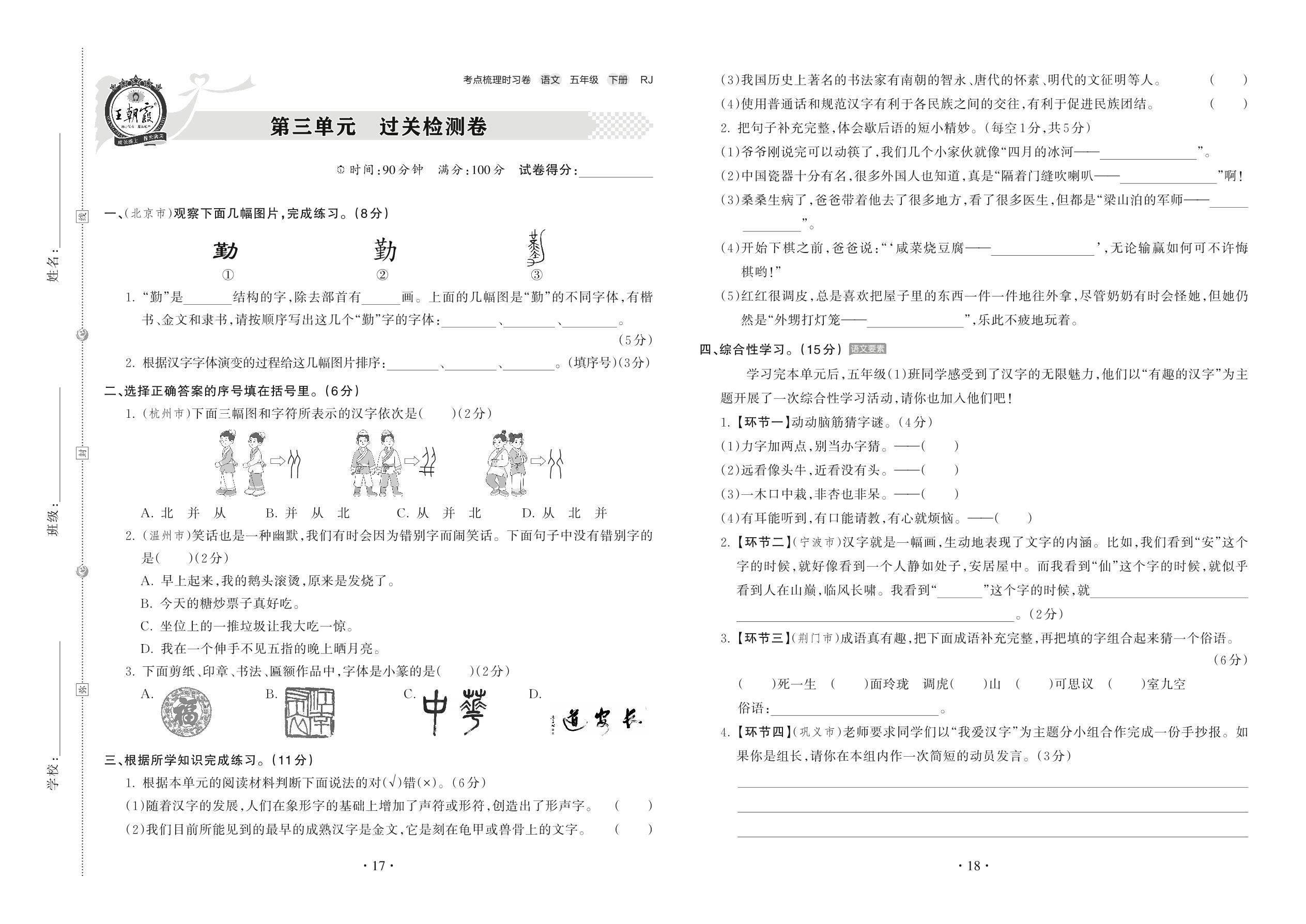 2022下册五年级语文人教版 第三单元 过关检测卷