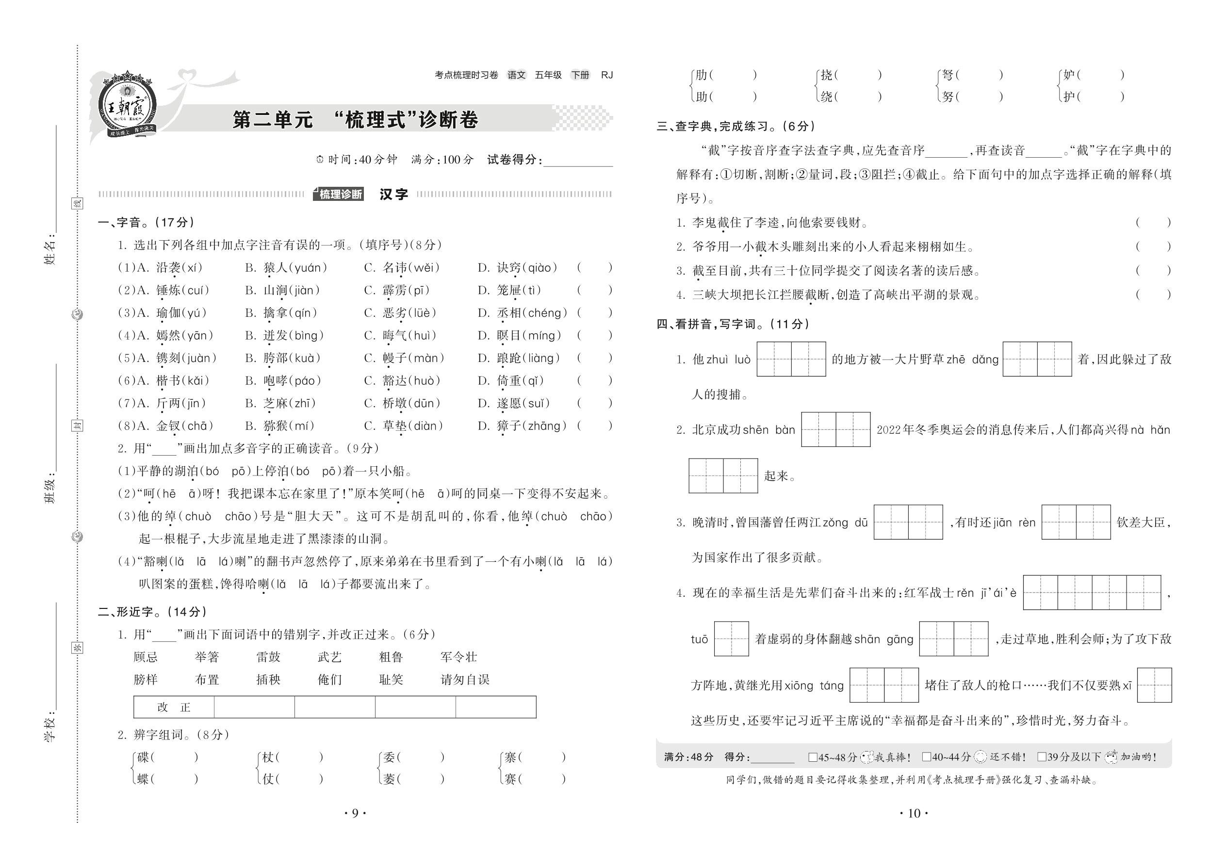 2022下册五年级语文人教版 第二单元 “梳理式”诊断卷