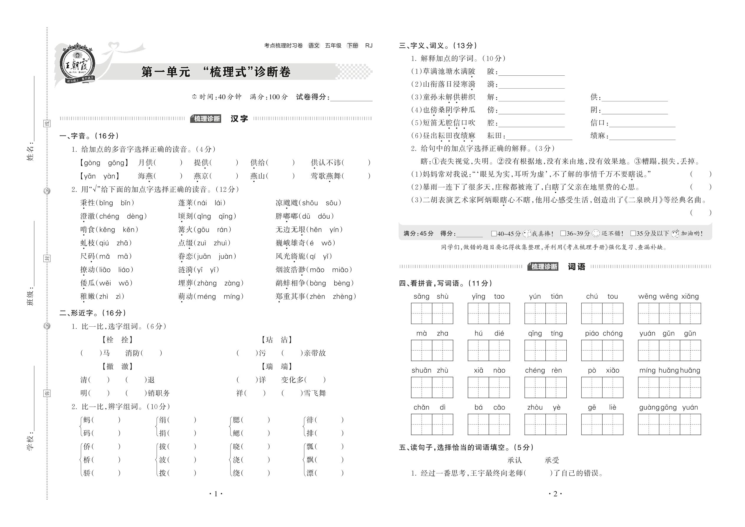 2022下册五年级语文人教版 第一单元 “梳理式”诊断卷