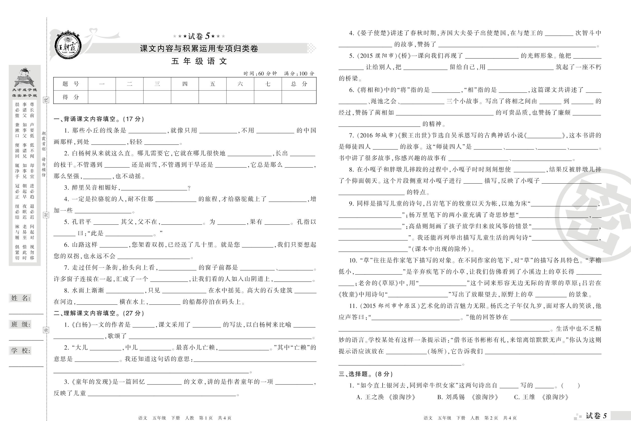 王朝霞期末专项卷——课文内容与积累运用专项归类卷五年级下册语文(人教版)_R210801224939【5】