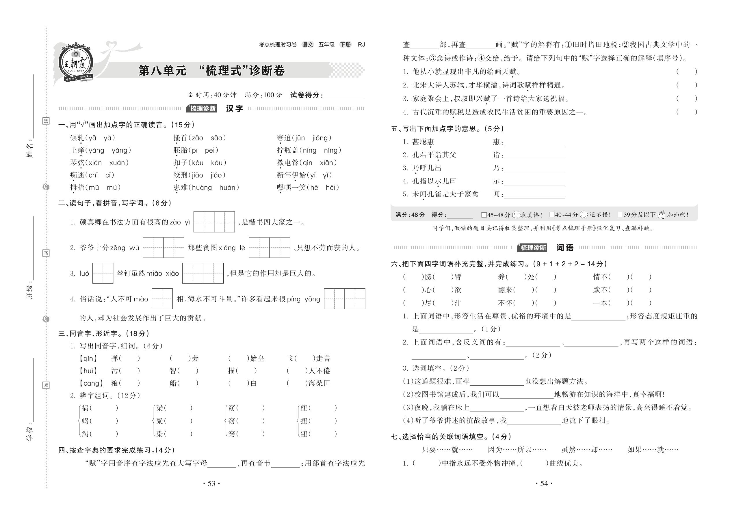 2022下册五年级语文人教版 第八单元 “梳理式”诊断卷