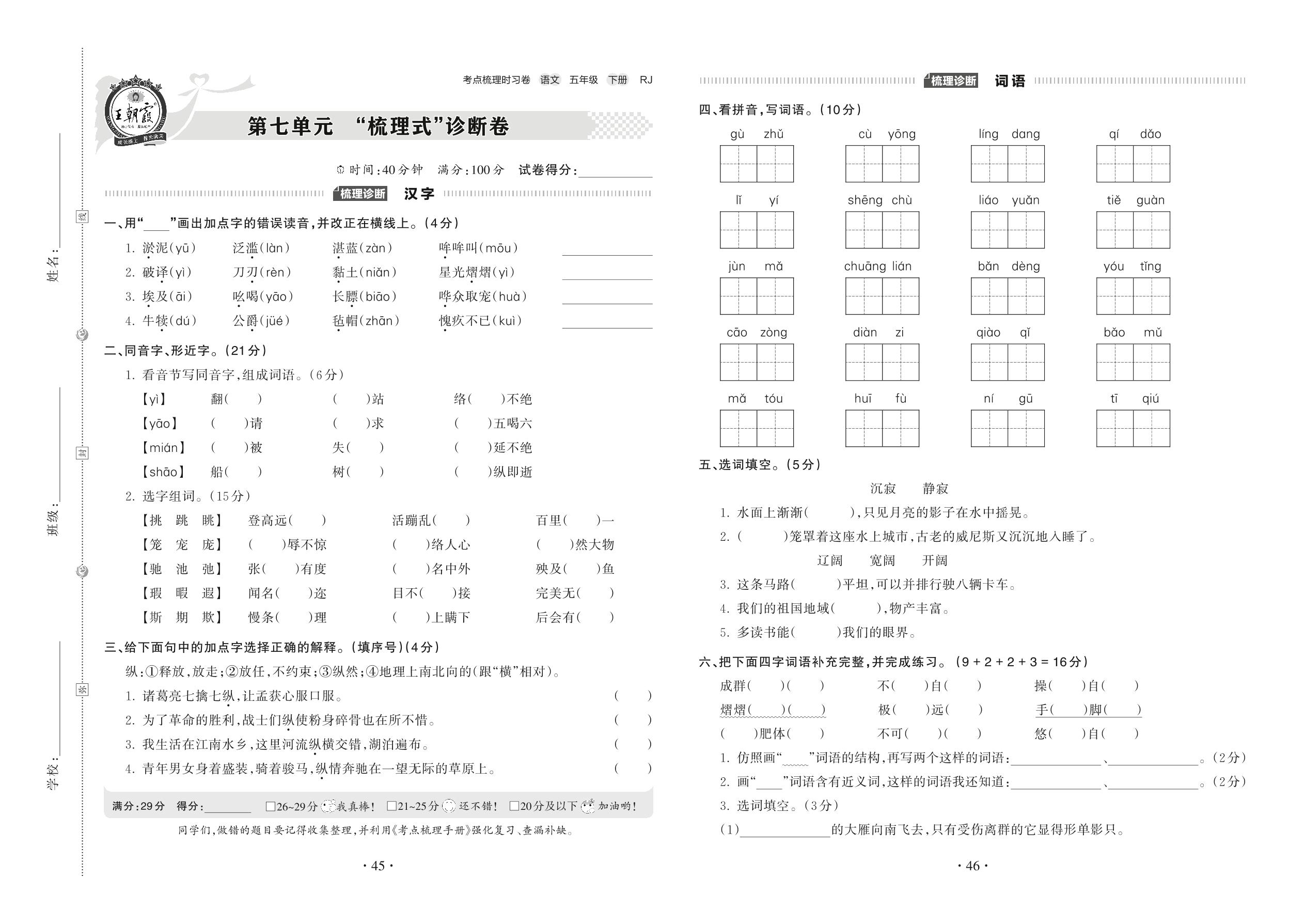 2022下册五年级语文人教版 第七单元 “梳理式”诊断卷