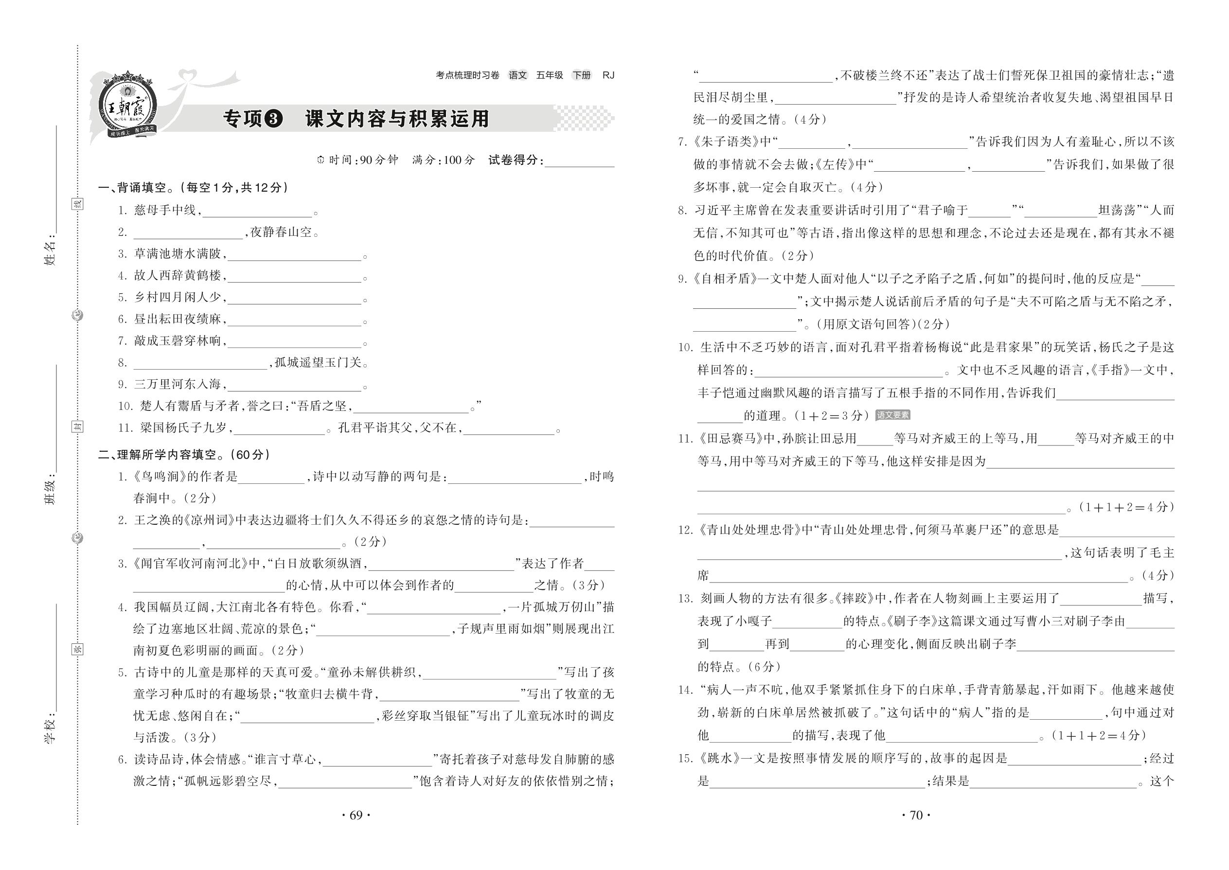 2022下册五年级语文人教版 专项3 课文内容与积累运用