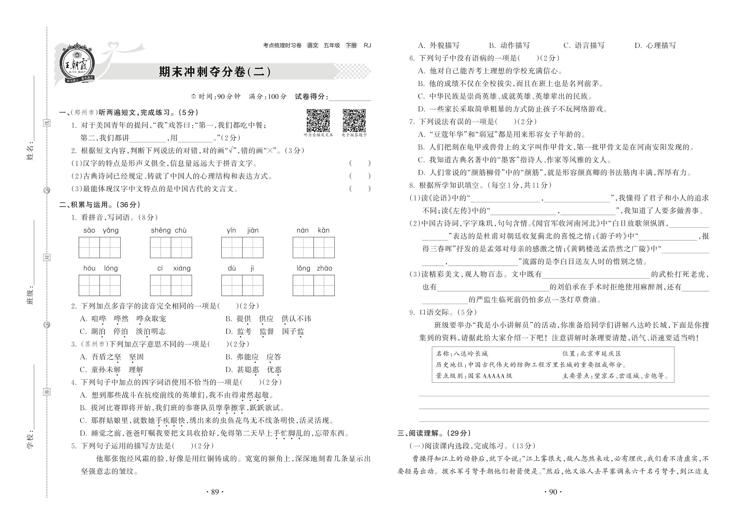 2022下册五年级语文人教版 期末冲刺夺分卷(二)