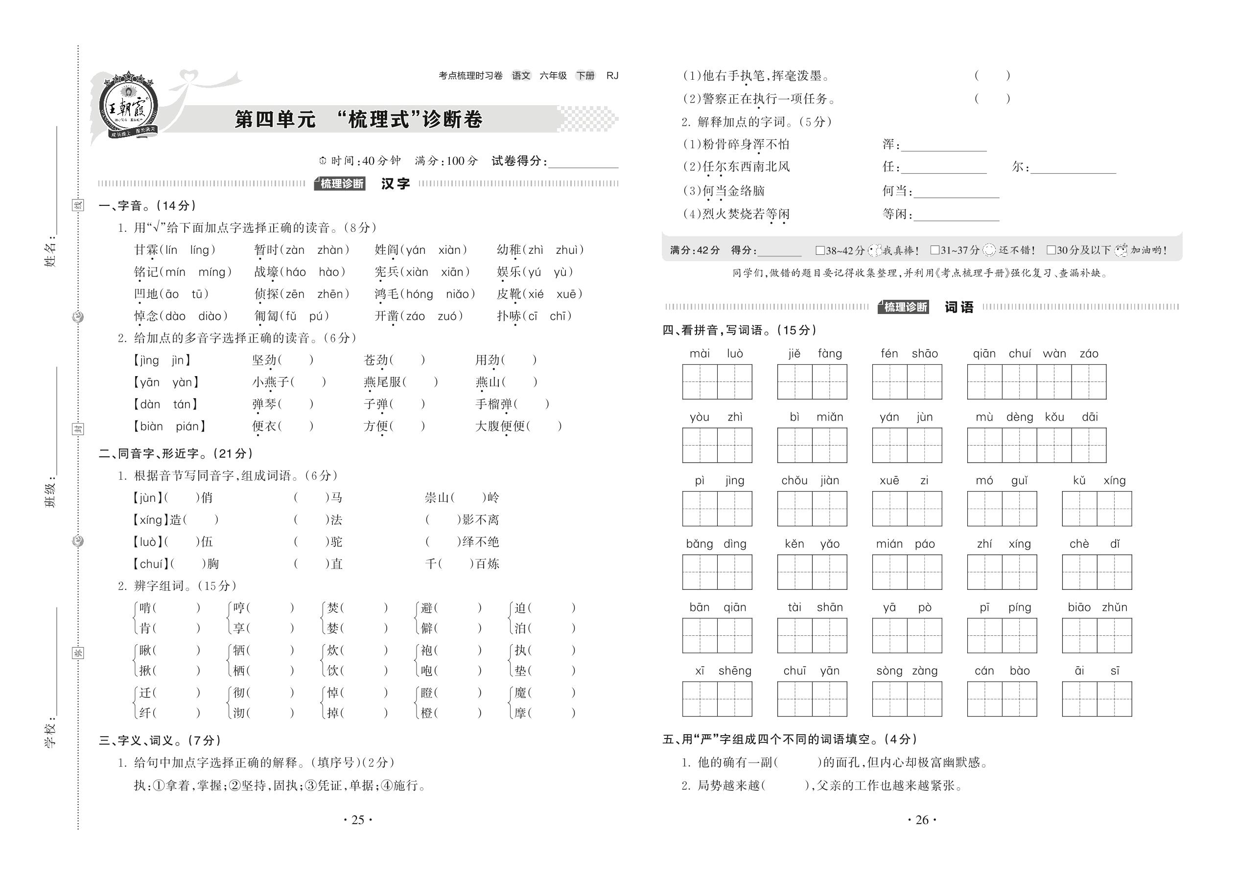 2022下册六年级语文人教版 第四单元 “梳理式”诊断卷