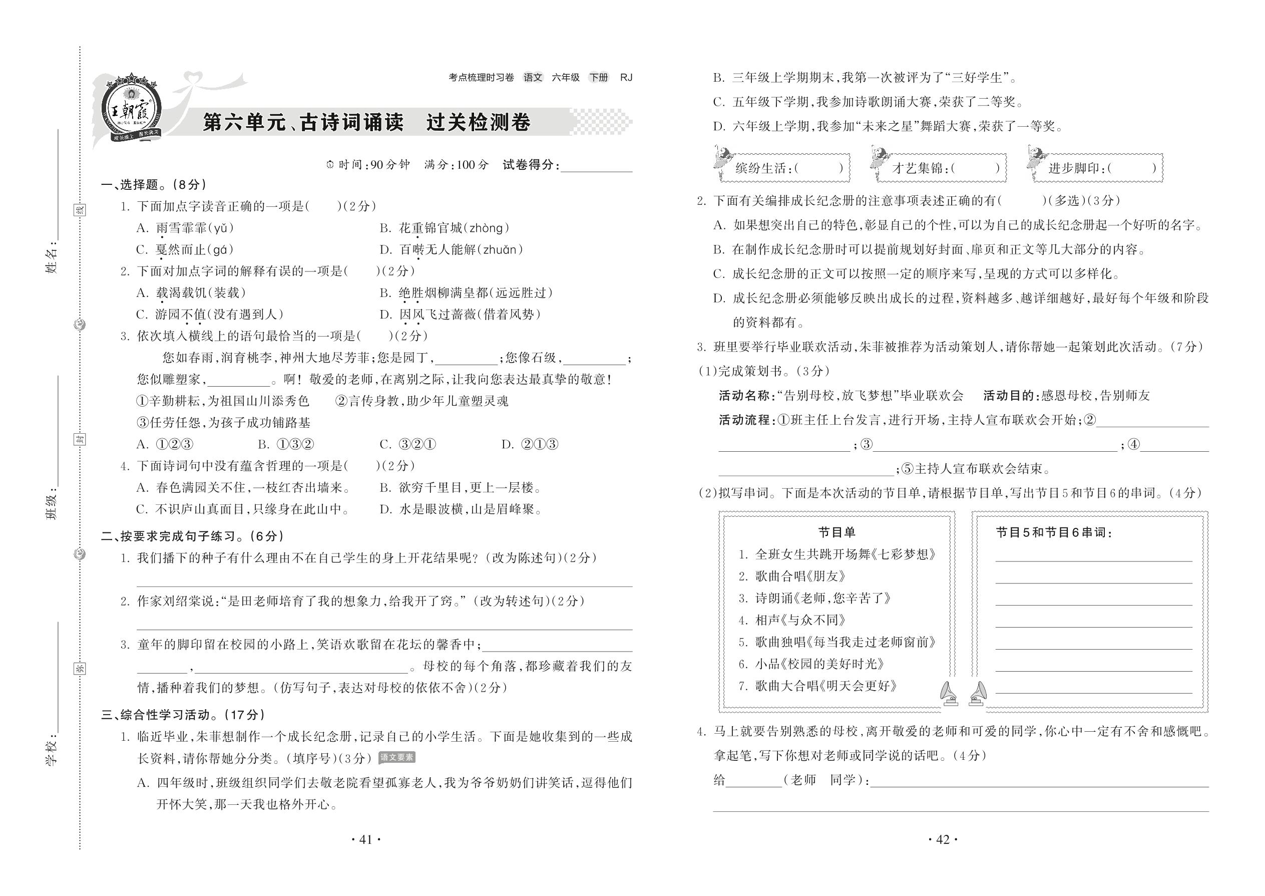 2022下册六年级语文人教版 第六单元 古诗词诵读 过关检测卷