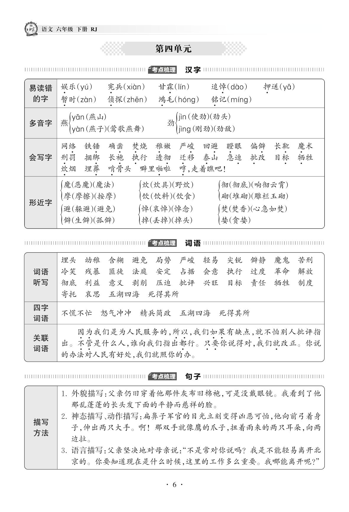 2022下册六年级语文人教版 考点梳理手册——第四单元