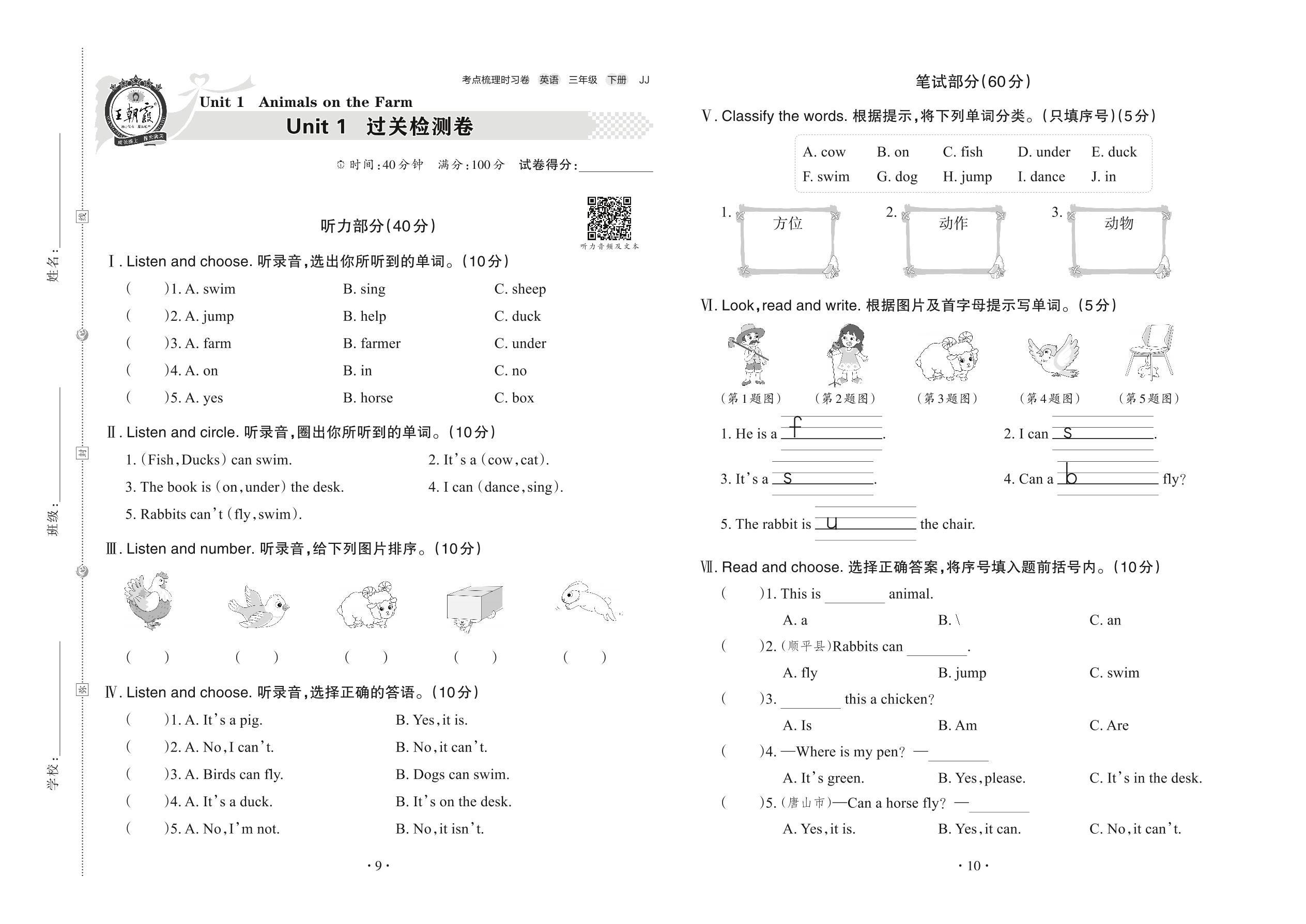 2022下册三年级英语冀教版 Unit 1 过关检测卷