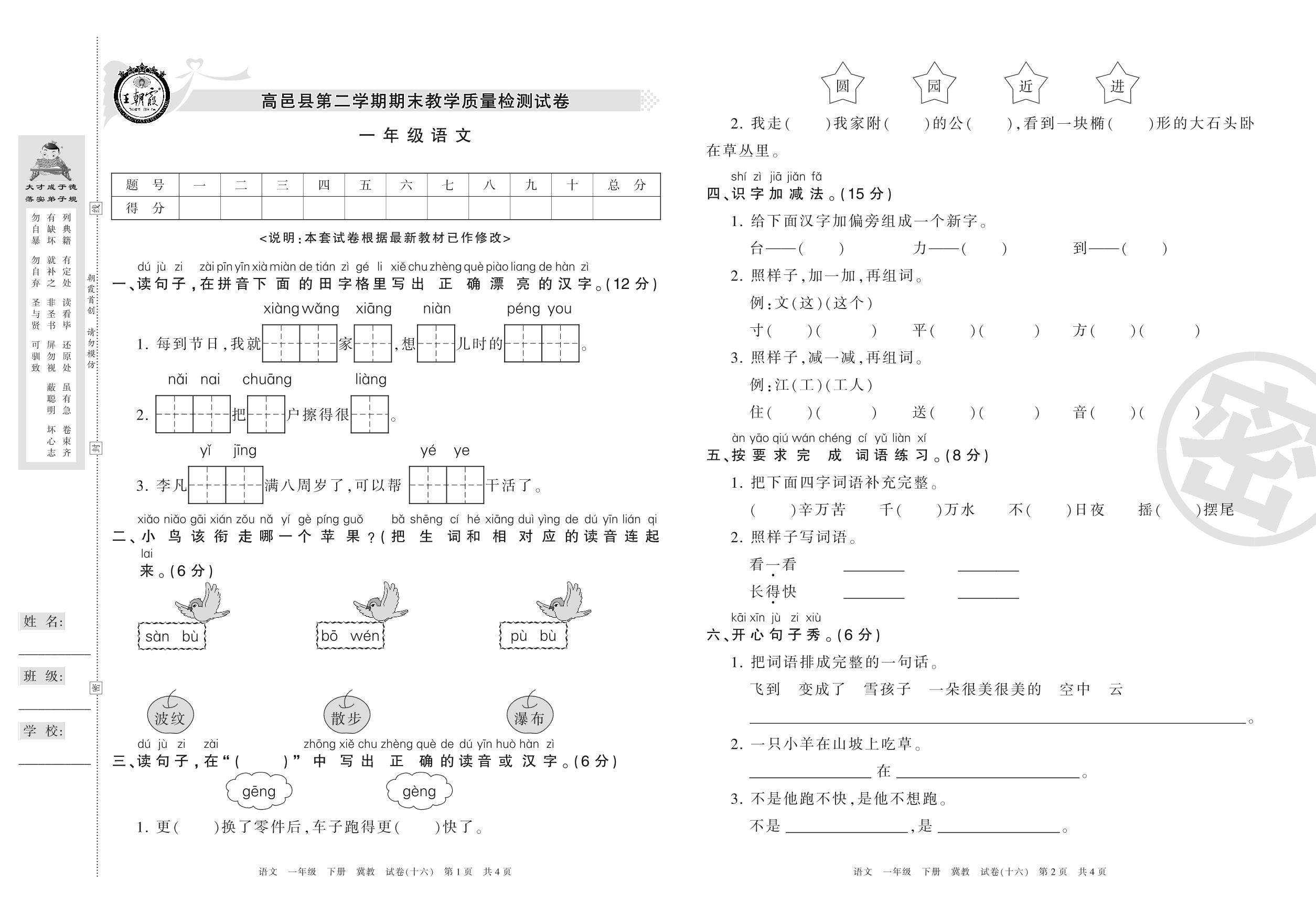 2015-2016学年第二学期石家庄市高邑县一年级语文试卷(冀教版)【16】