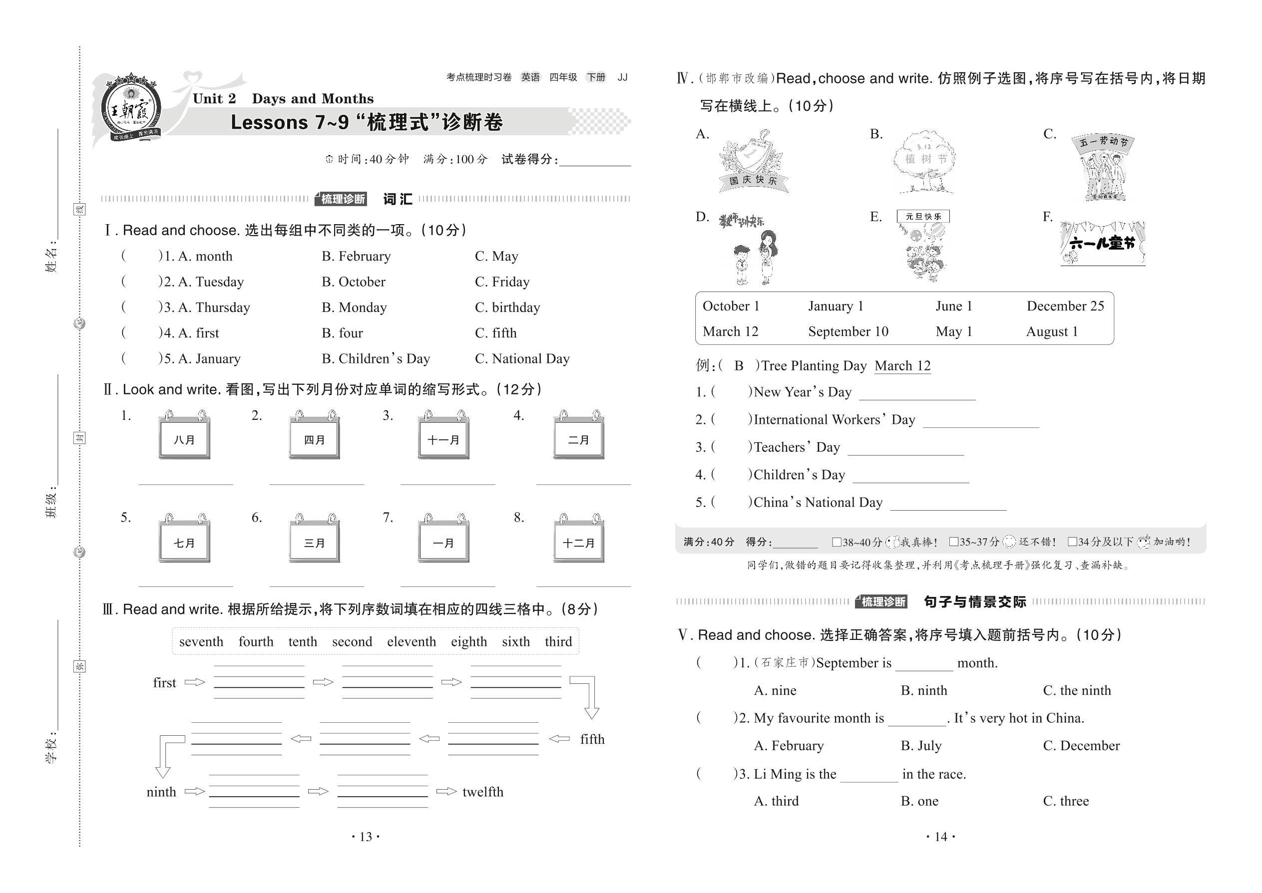 2022下册四年级英语冀教版 Unit 2 Lessons 7~9 “梳理式”诊断卷
