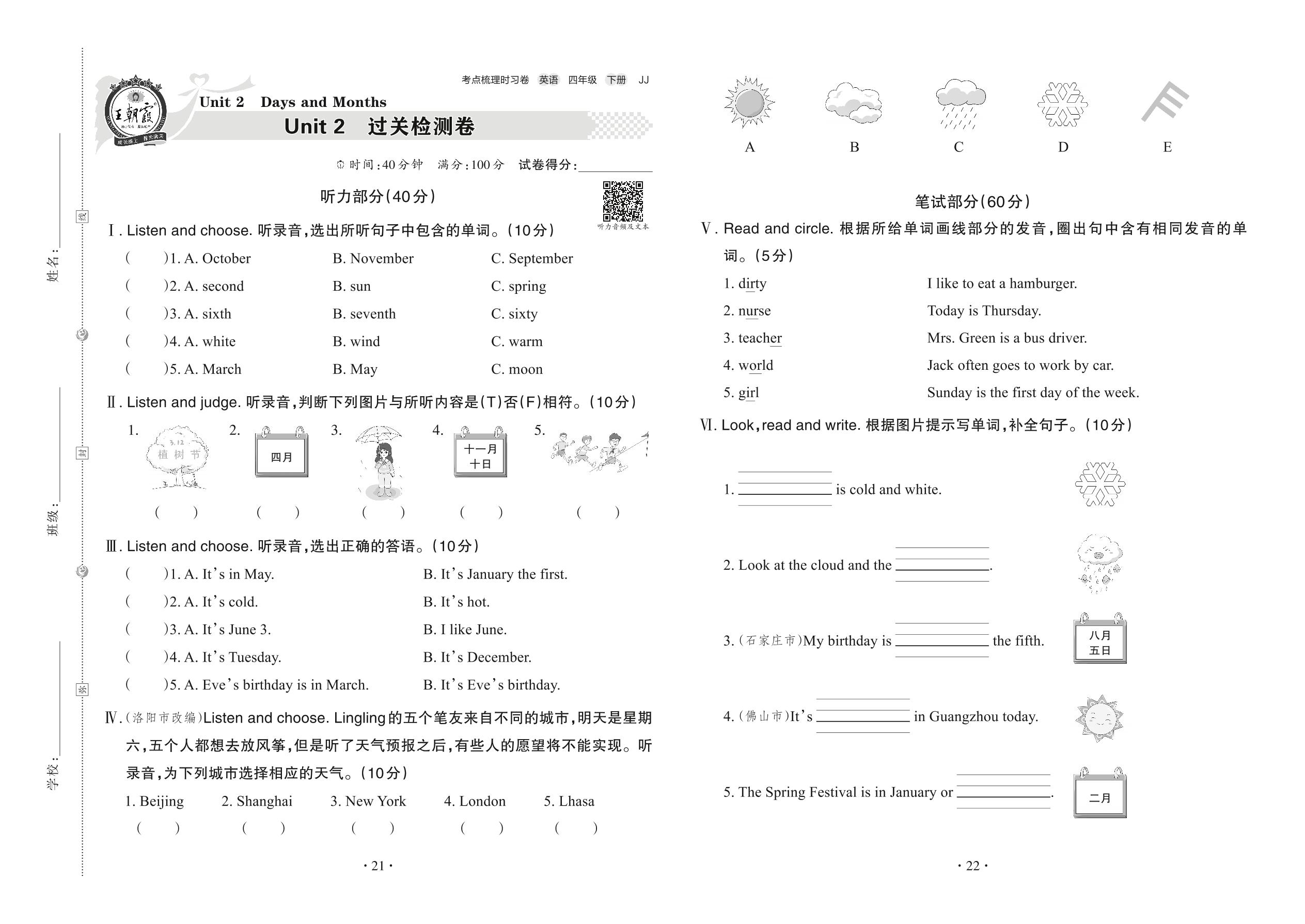 四年级英语冀教版下册单元卷