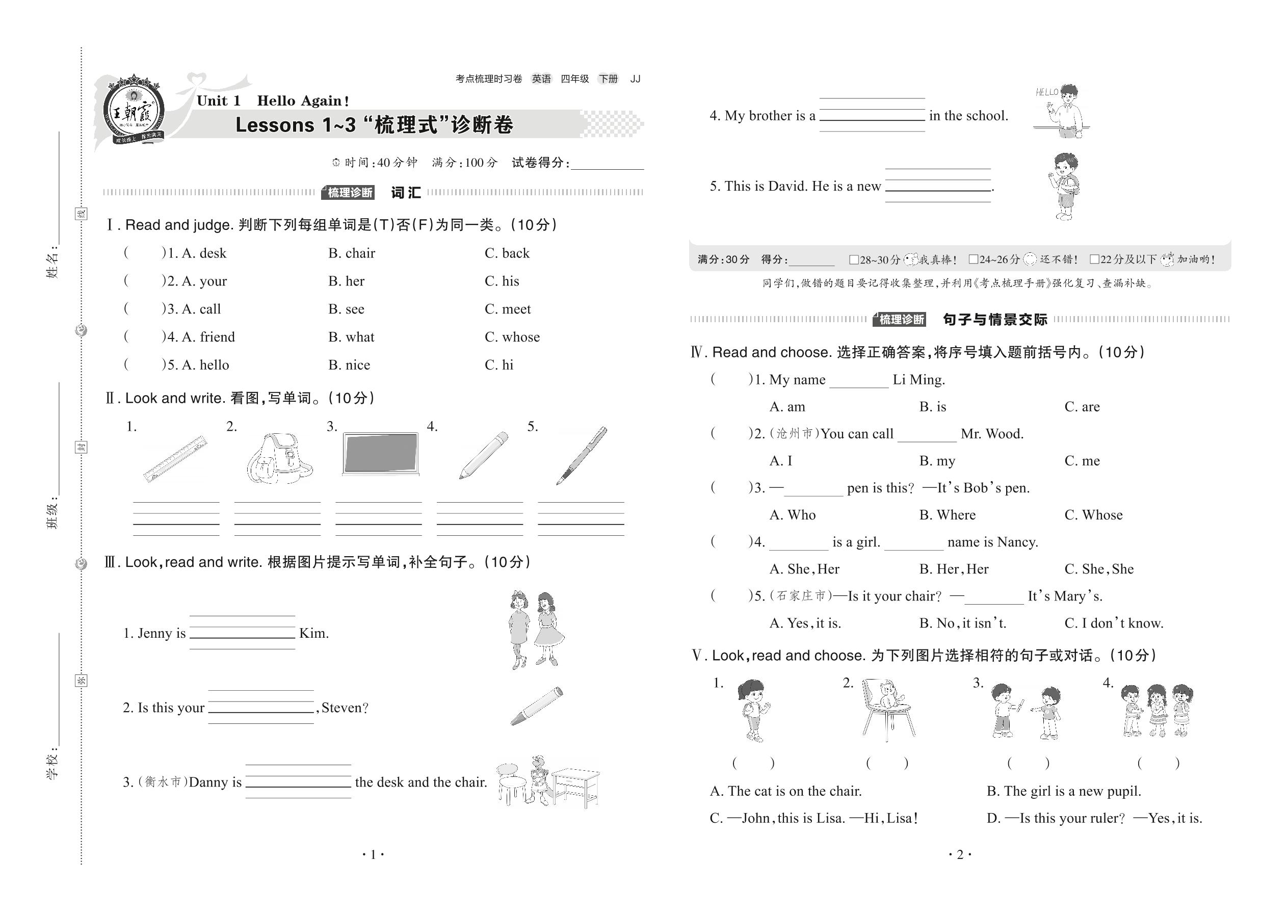 2022下册四年级英语冀教版 Unit 1 Lessons 1~3 “梳理式”诊断卷
