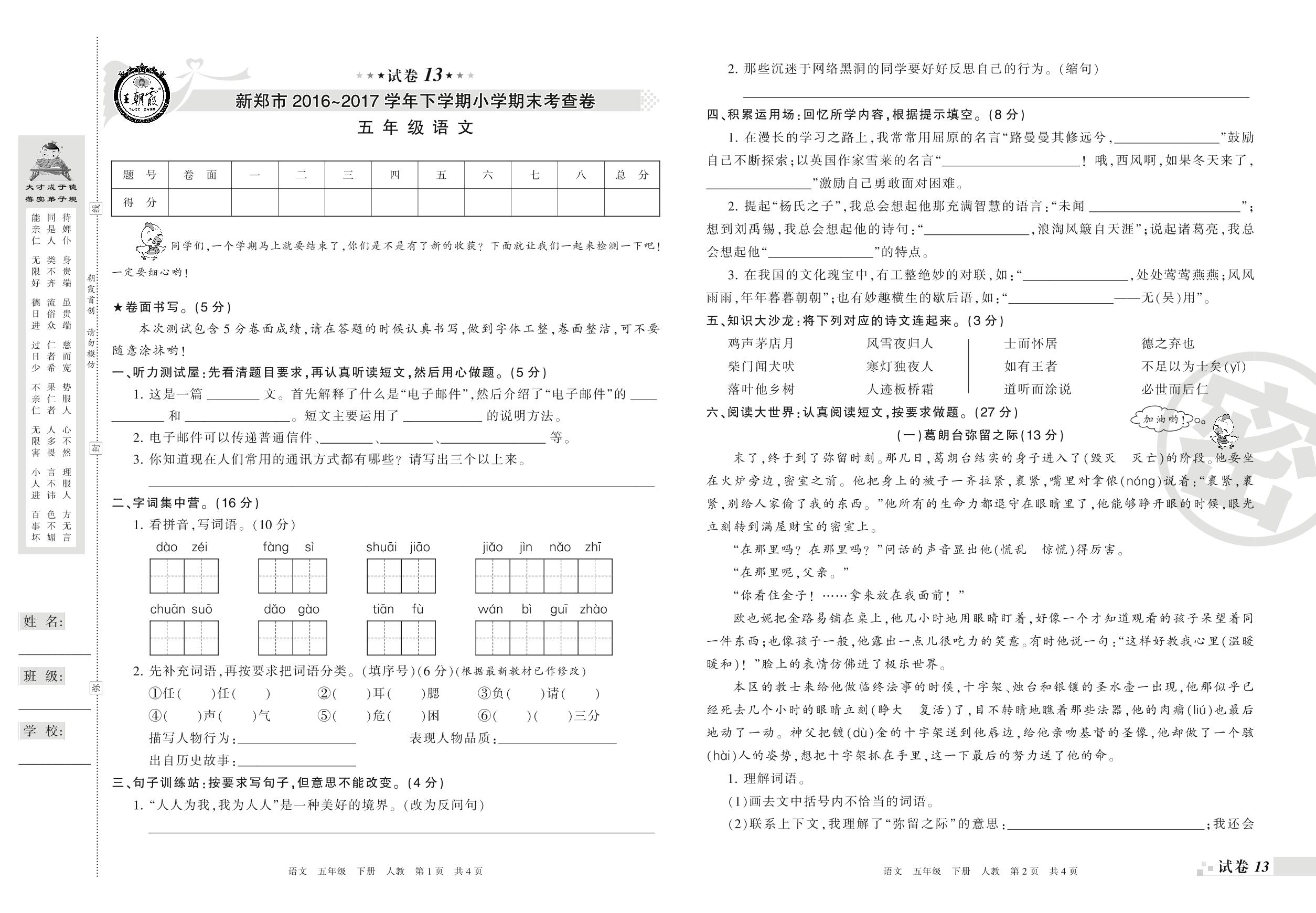 2016-2017学年第二学期新郑市五年级语文试卷(人教版)【13】