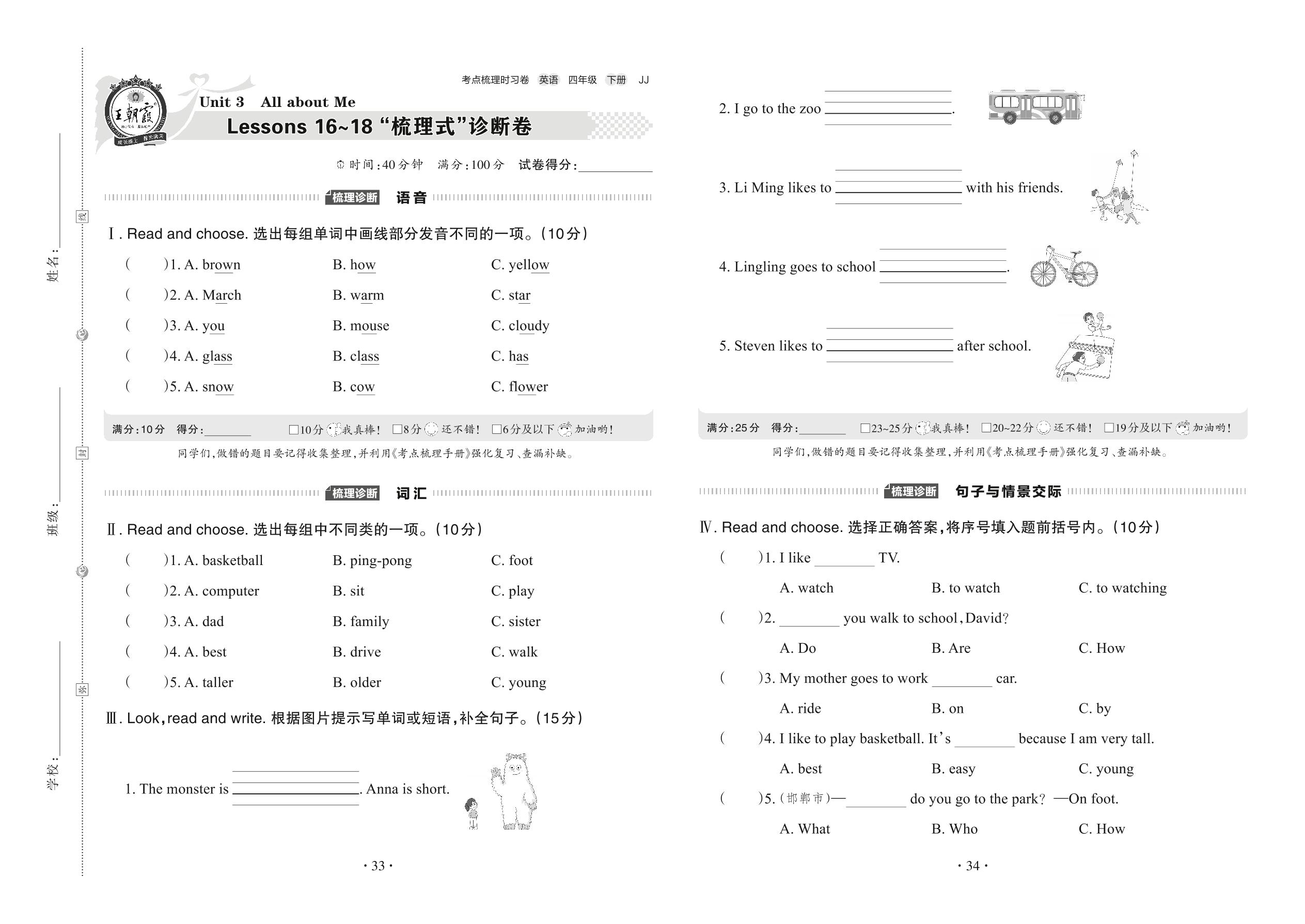 2022下册四年级英语冀教版 Unit 3 Lessons 16~18 “梳理式”诊断卷
