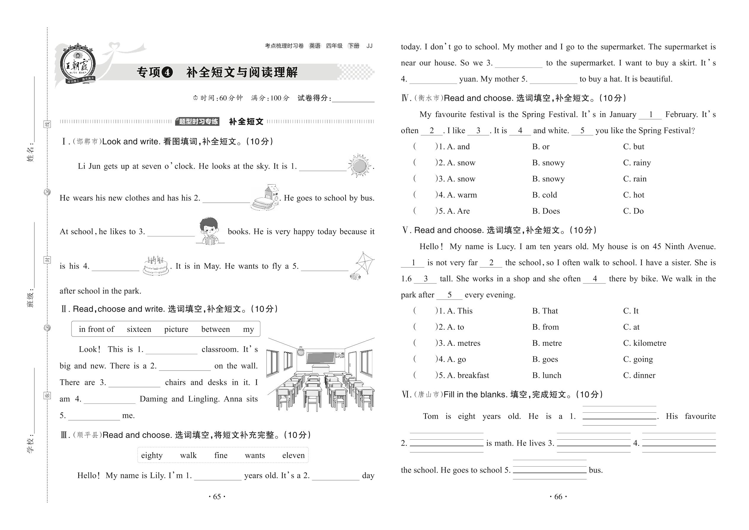 2022下册四年级英语冀教版 专项4 补全短文与阅读理解