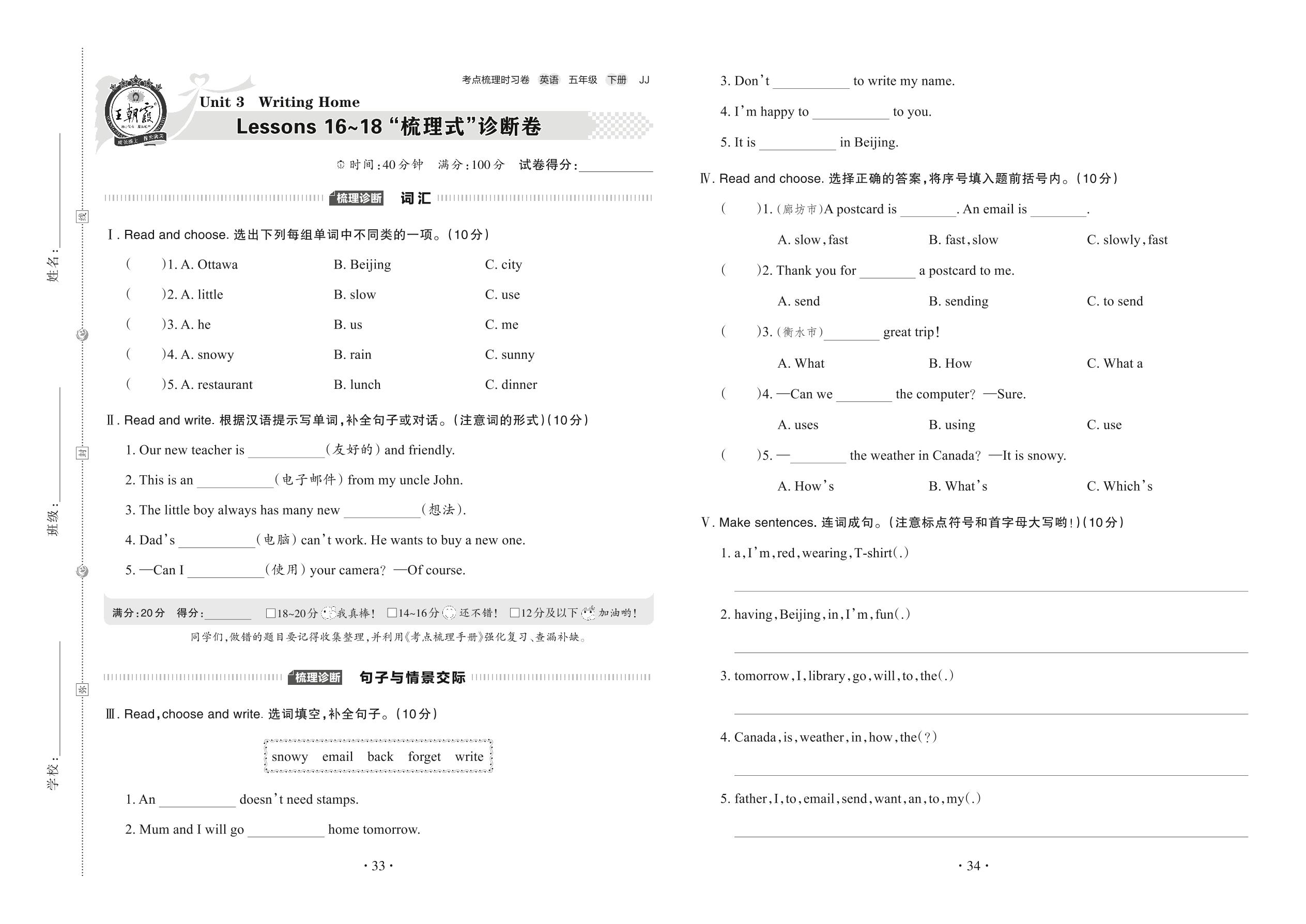 2022下册五年级英语冀教版 Unit 3 Lessons 16~18 “梳理式”诊断卷