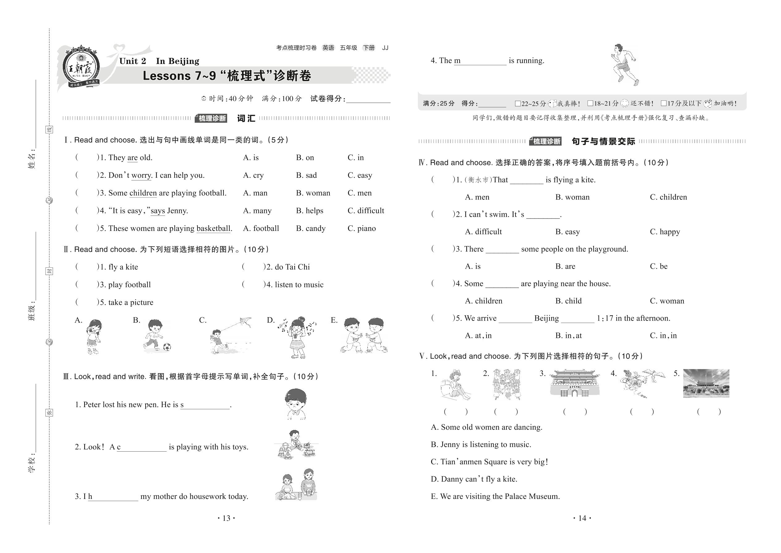 2022下册五年级英语冀教版 Unit 2 Lessons 7~9 “梳理式”诊断卷