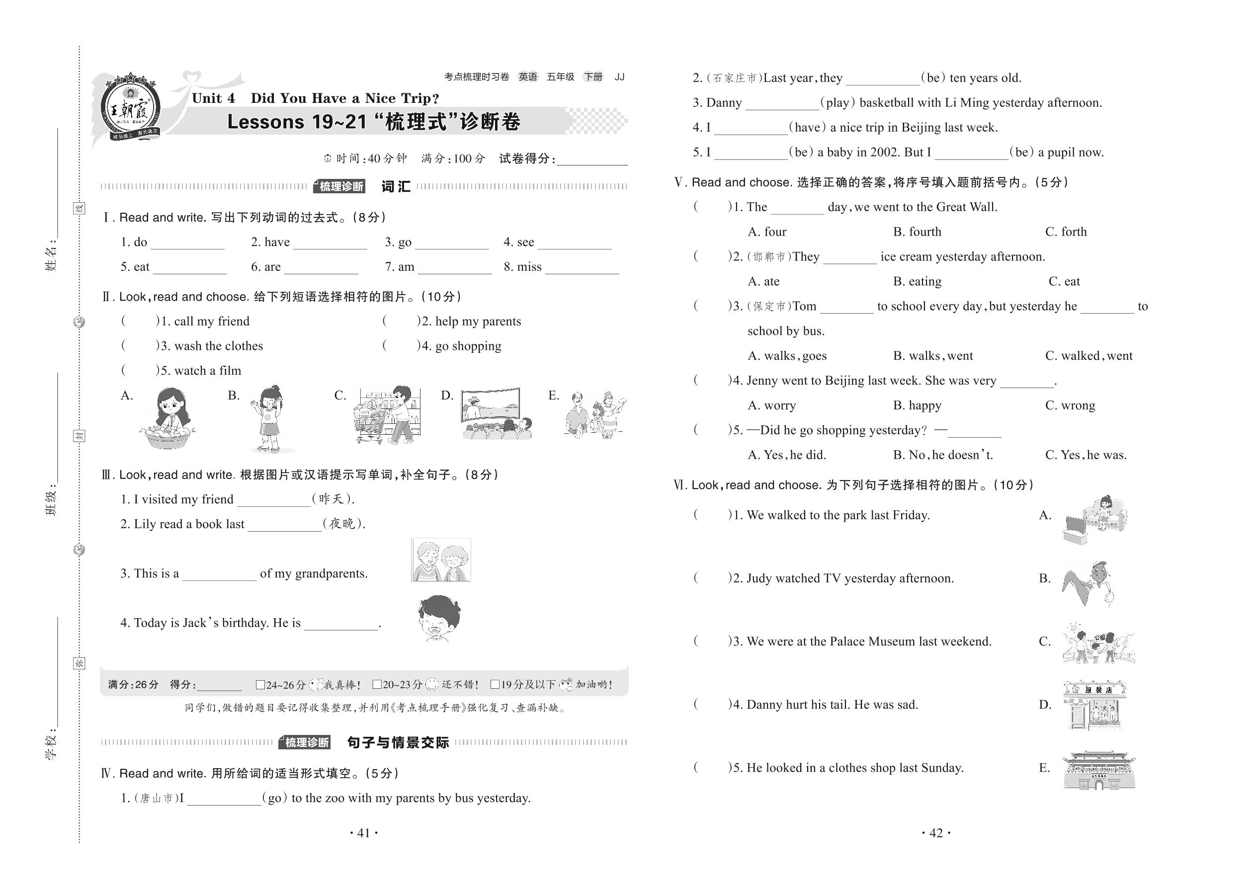 2022下册五年级英语冀教版 Unit 4 Lessons 19~21 “梳理式”诊断卷
