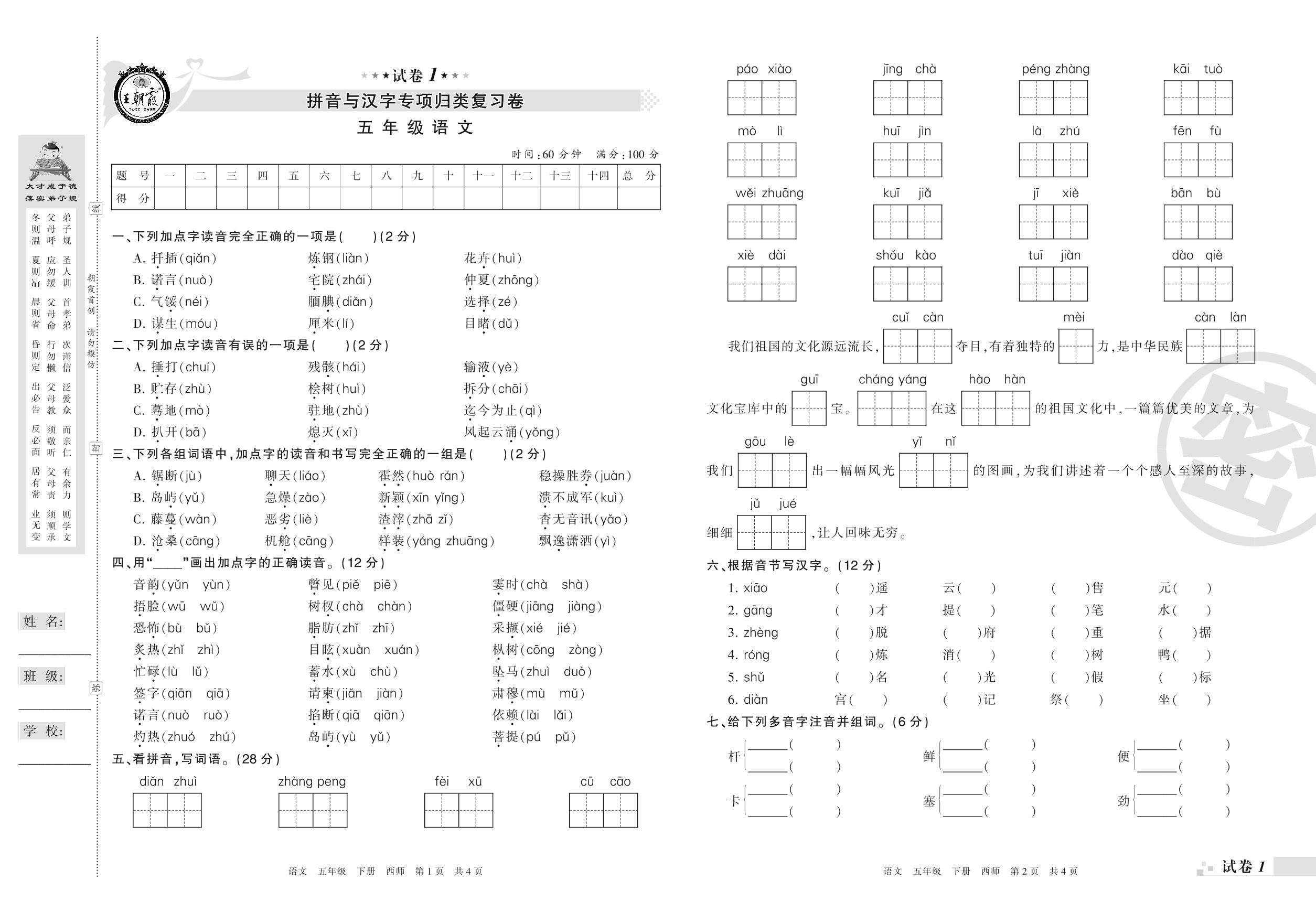 王朝霞期末专项卷——拼音与汉字专项归类复习卷五年级下册语文(西师版)_R210801225019【1】
