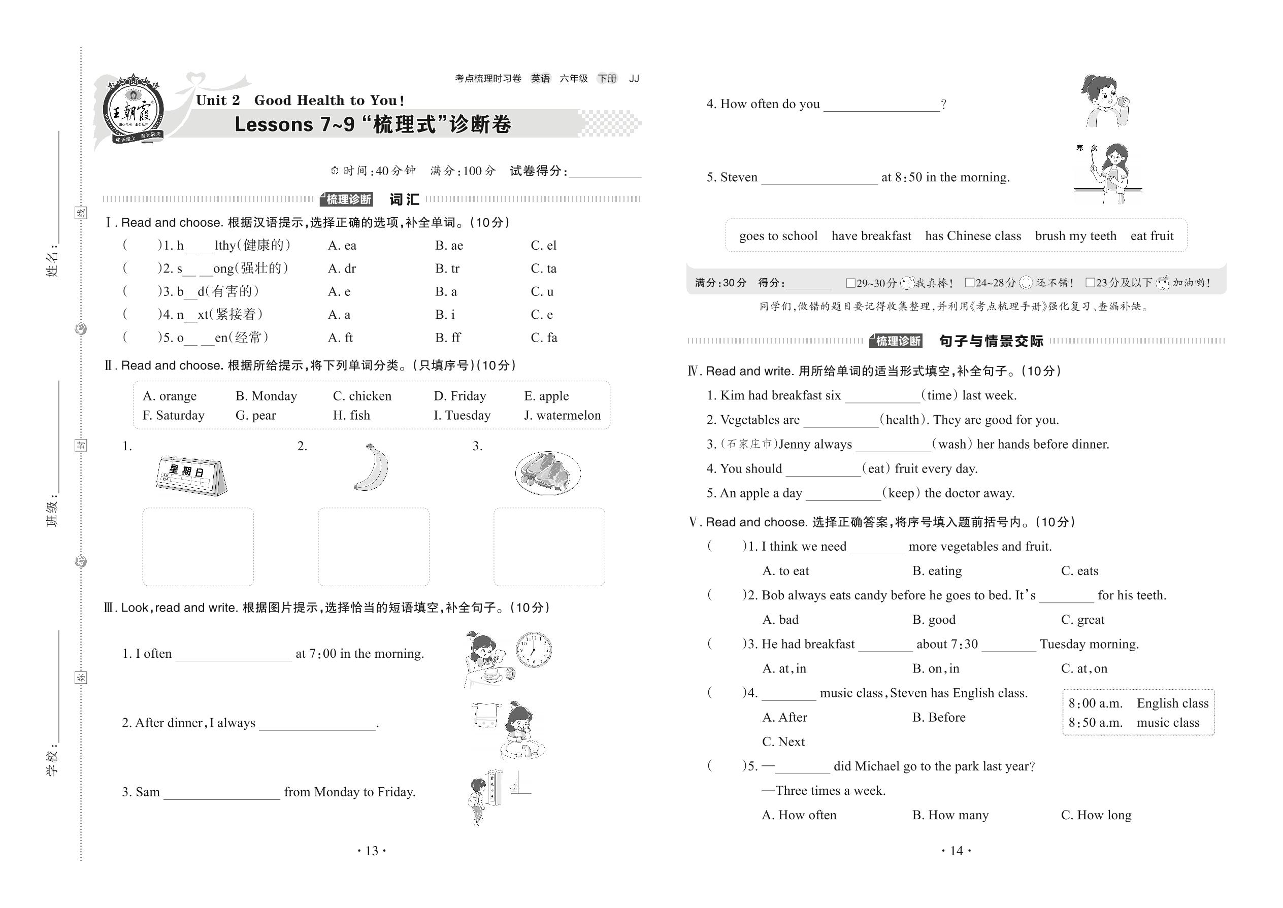 2022下册六年级英语冀教版 Unit 2 Lessons 7~9 “梳理式”诊断卷