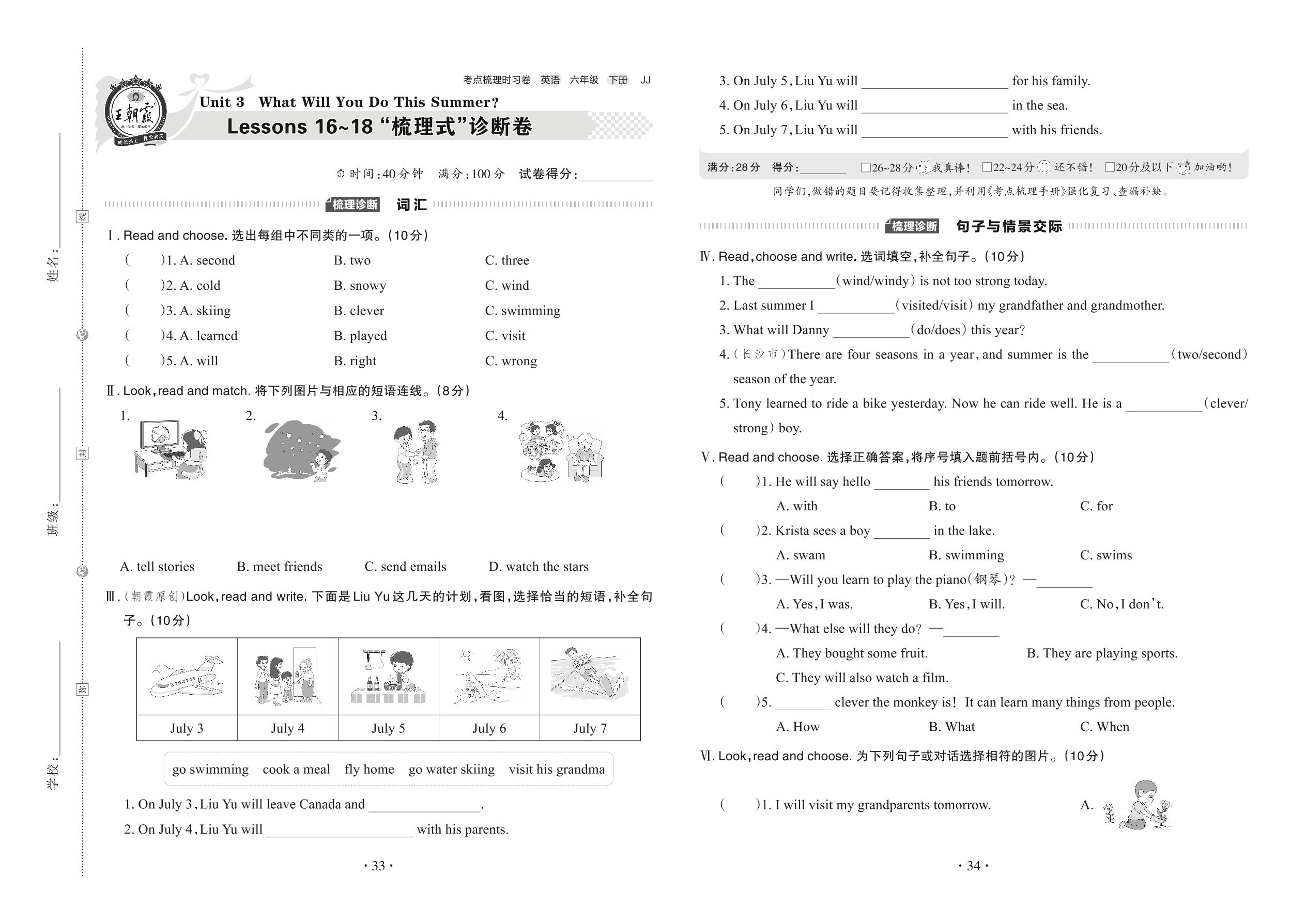 2022下册六年级英语冀教版 Unit 3 Lessons 16~18 “梳理式”诊断卷
