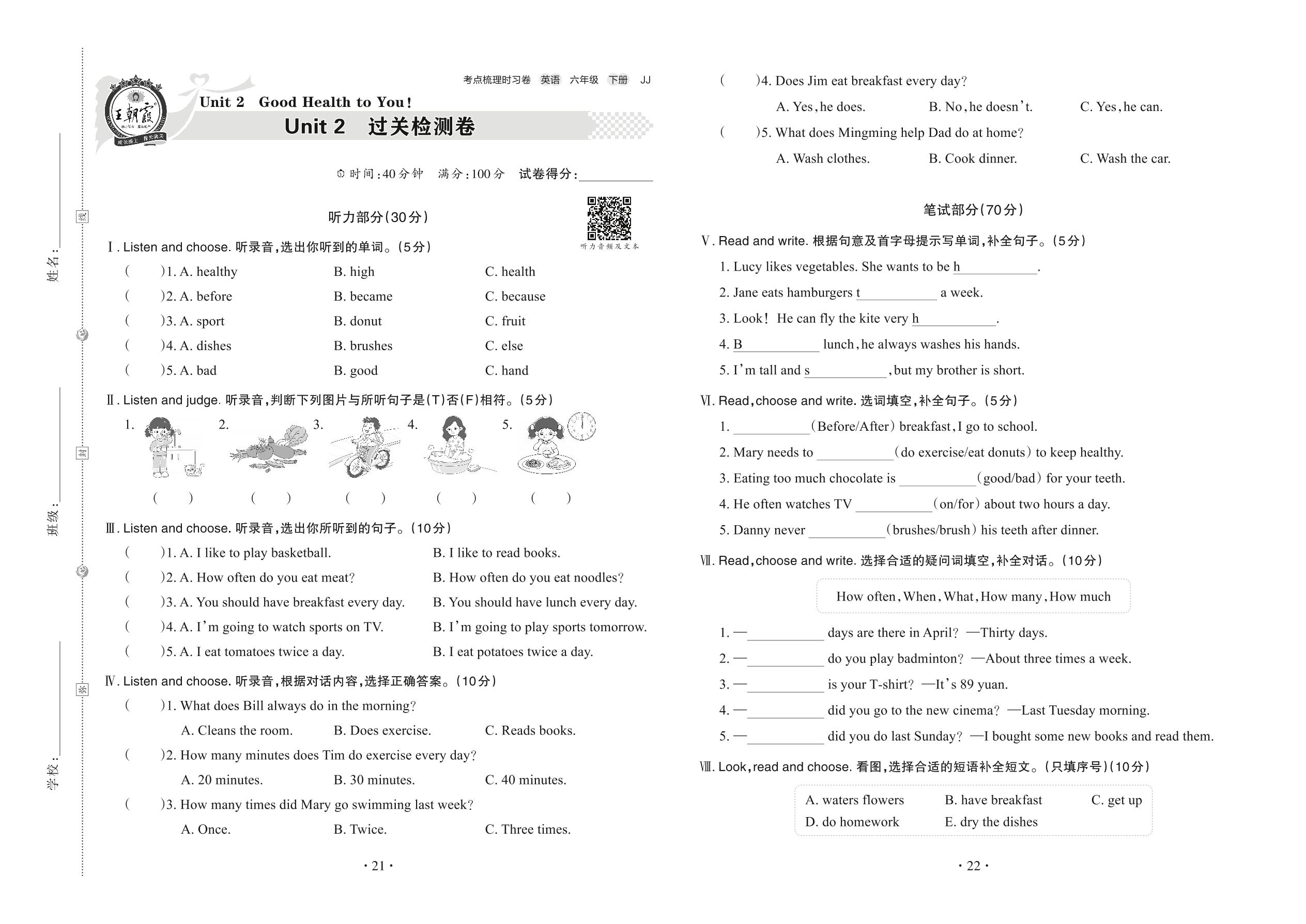 2022下册六年级英语冀教版 Unit 2 过关检测卷
