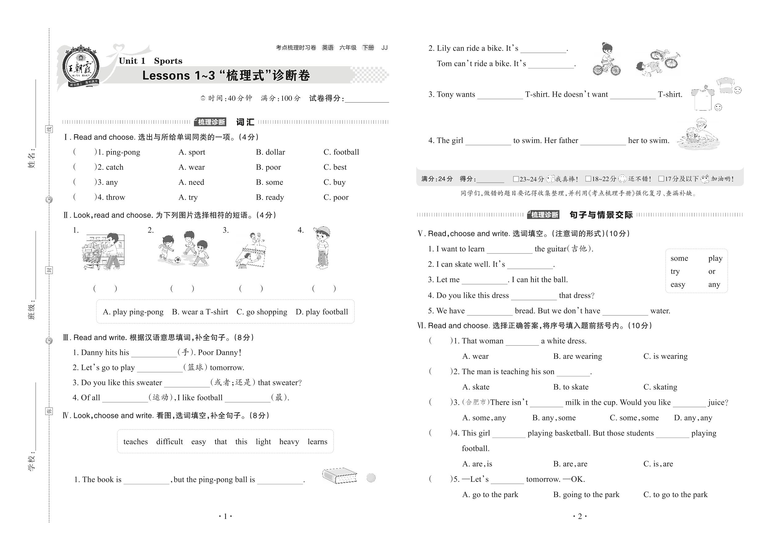 2022下册六年级英语冀教版 Unit 1 Lessons 1~3 “梳理式”诊断卷