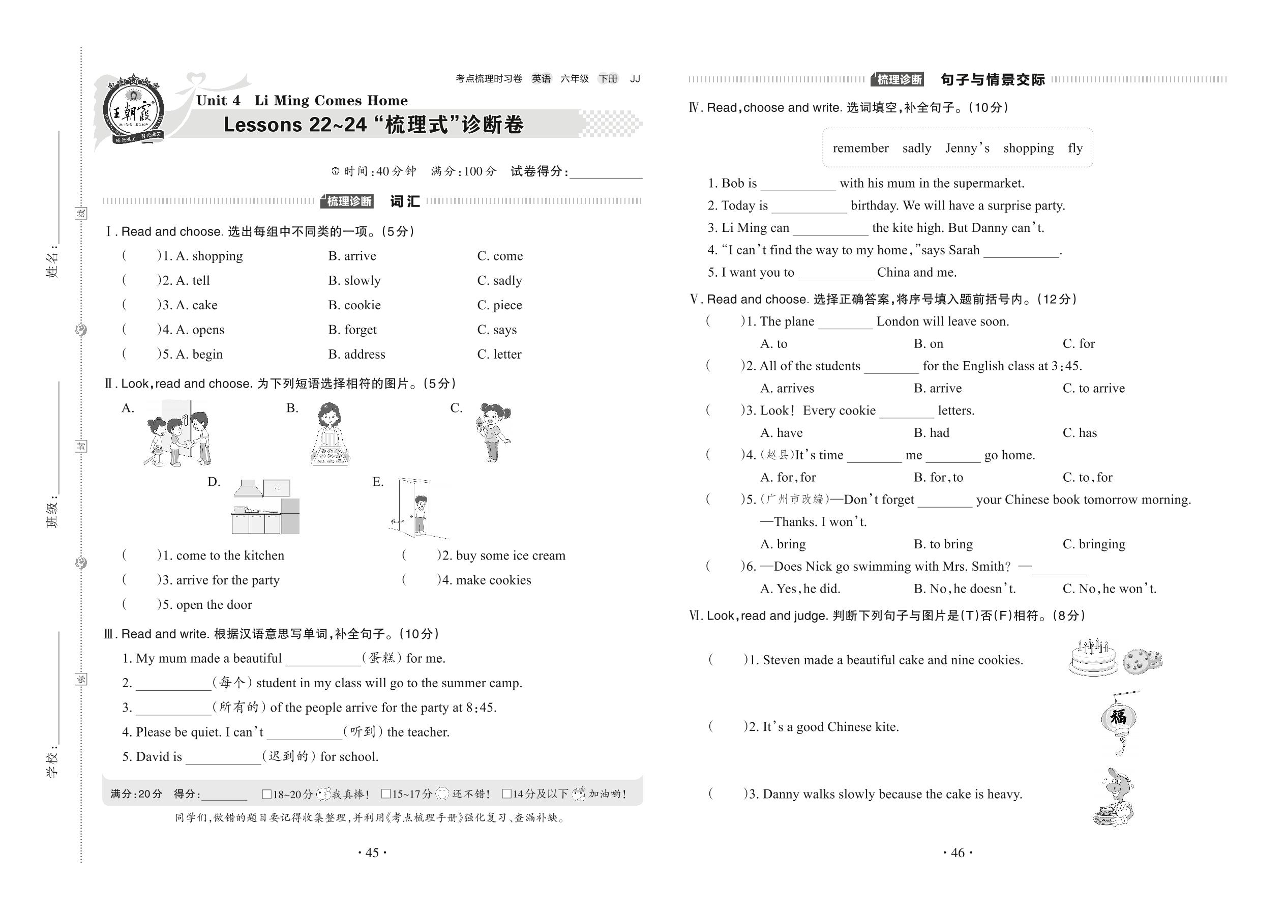 2022下册六年级英语冀教版 Unit 4 Lessons 22~24 “梳理式”诊断卷