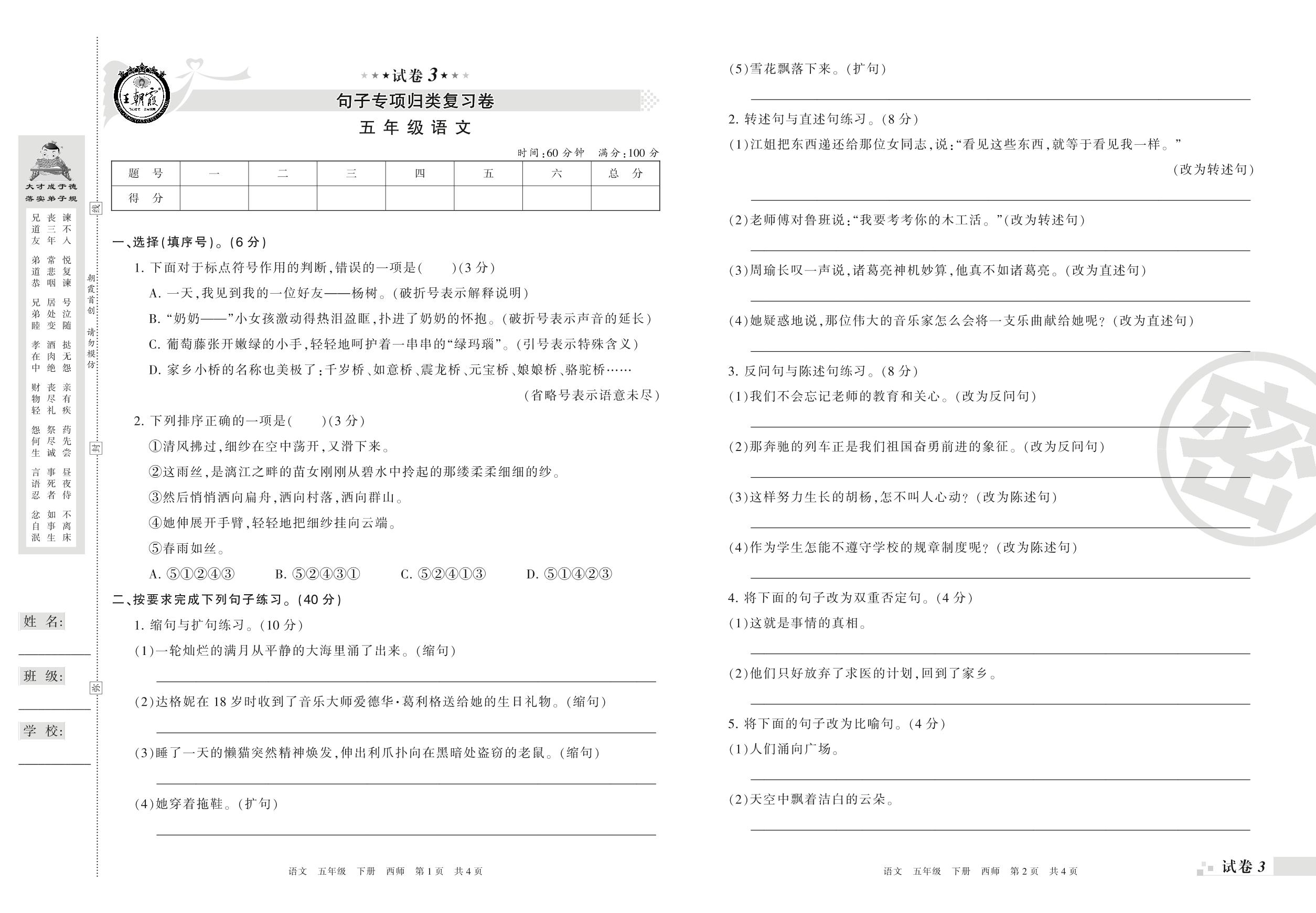 王朝霞期末专项卷——句子专项归类复习卷五年级下册语文(西师版)_R210801225024【3】