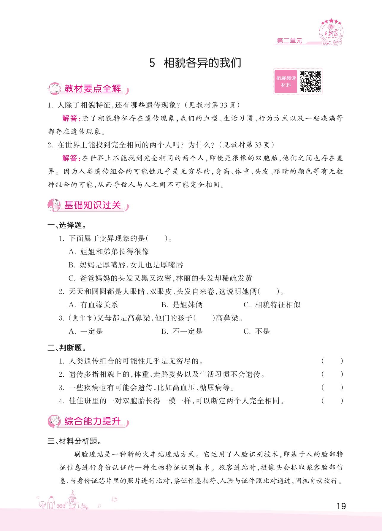 2022下册六年级科学教科版 第二单元——5 相貌各异的我们