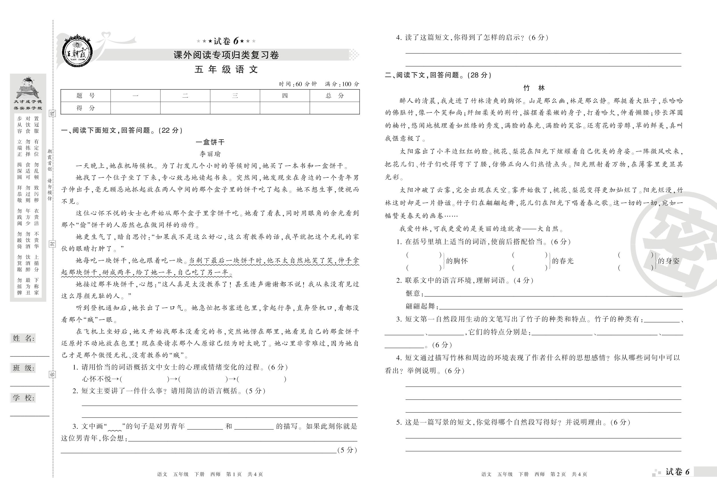 王朝霞期末专项卷——课外阅读专项归类复习卷五年级下册语文(西师版)_R210801225036【6】