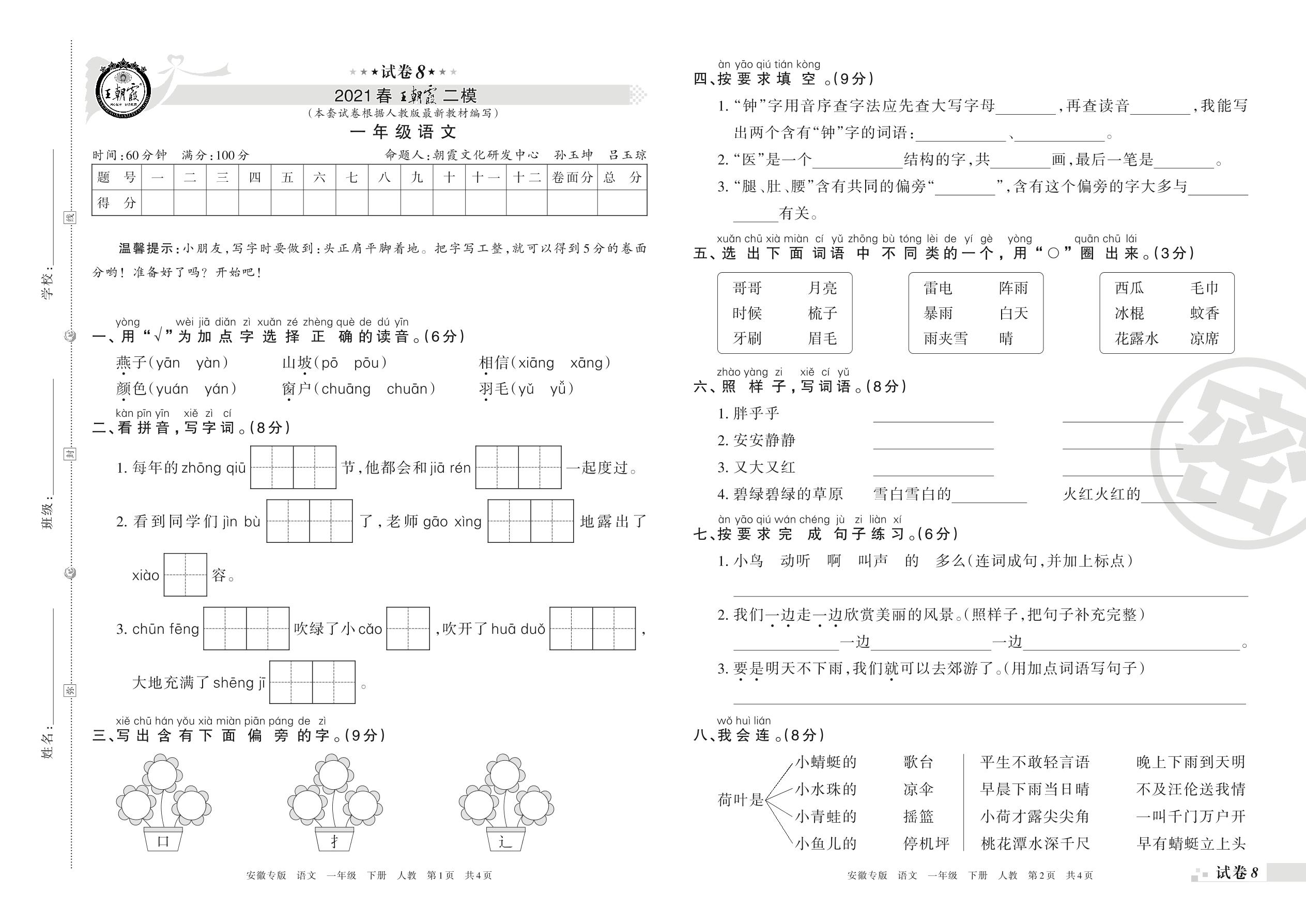 王朝霞期末模拟卷一年级下册语文(人教版)_R210731173045【8】