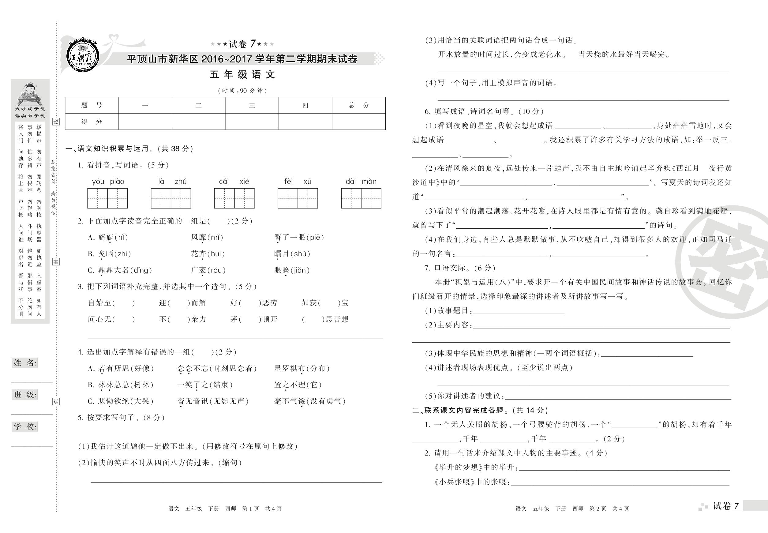 2016-2017学年第二学期平顶山市新华区五年级语文试卷(西师版)【7】