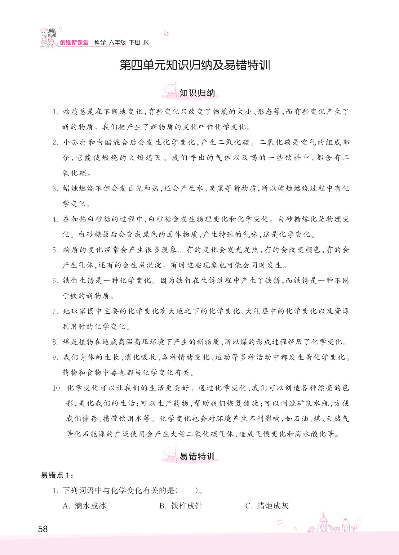 2022下册六年级科学教科版 第四单元知识归纳及易错特训