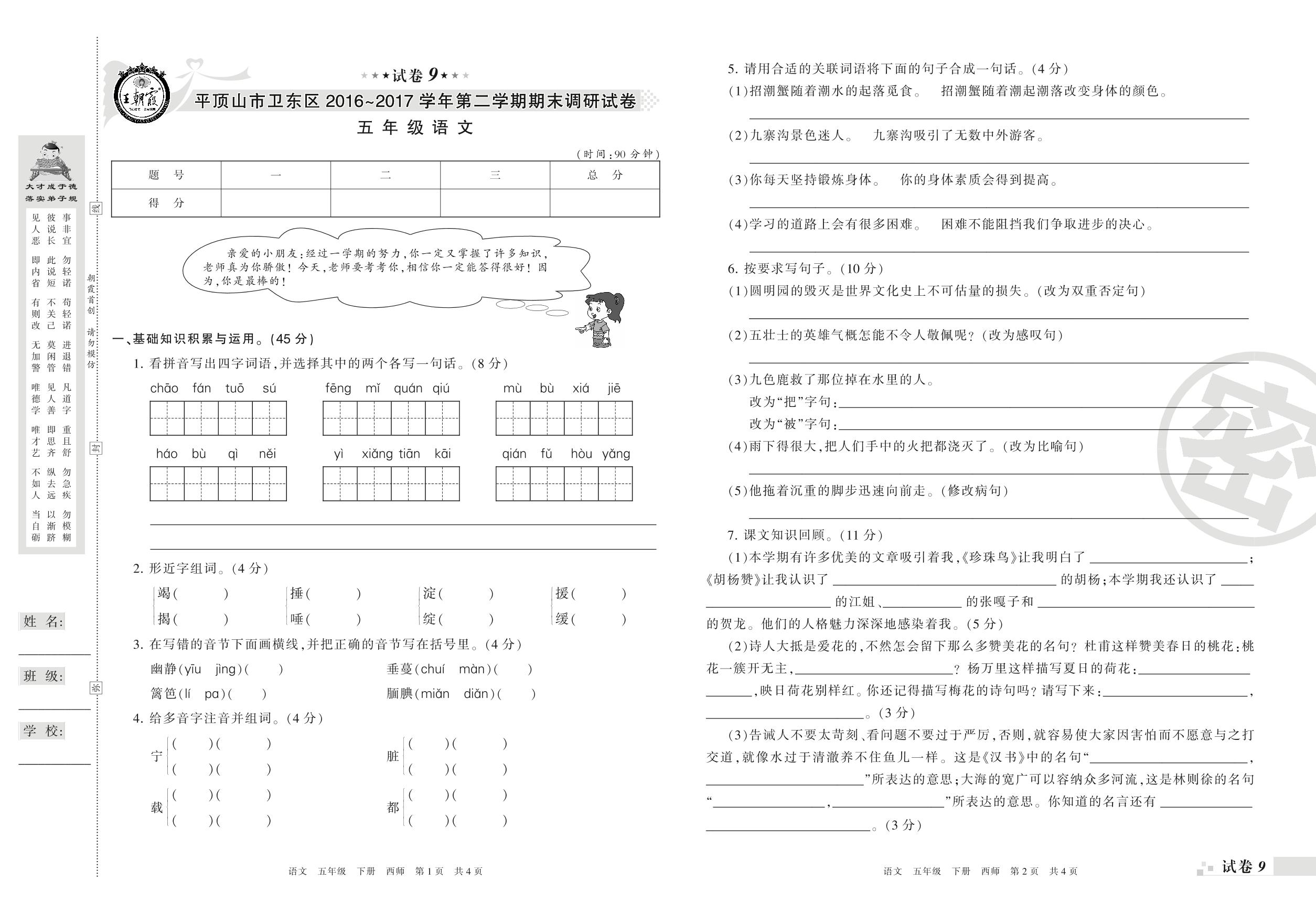 2016-2017学年第二学期平顶山市卫东区五年级语文试卷(西师版)【9】
