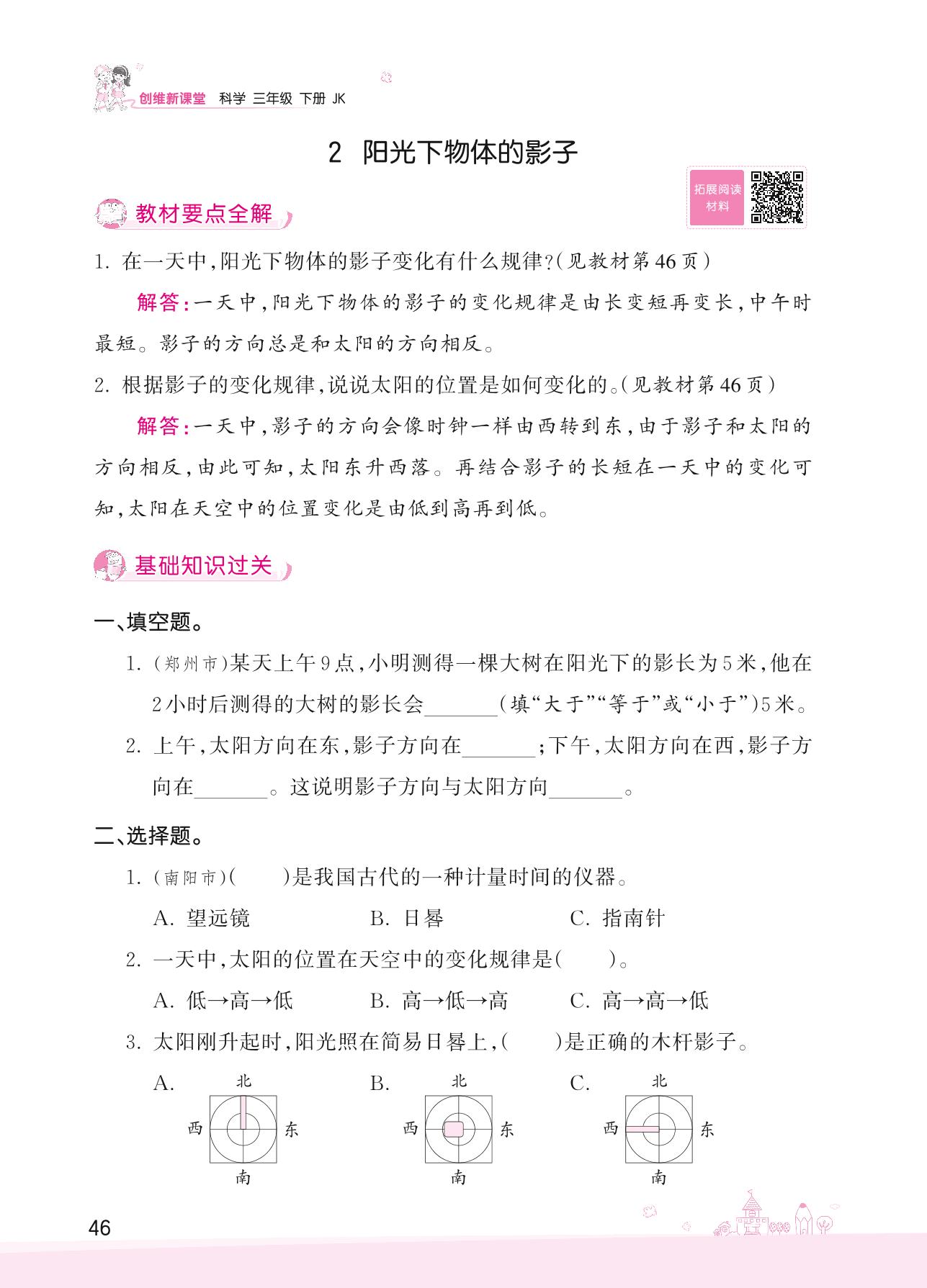 2022下册三年级科学教科版 第三单元——2 阳光下物体的影子