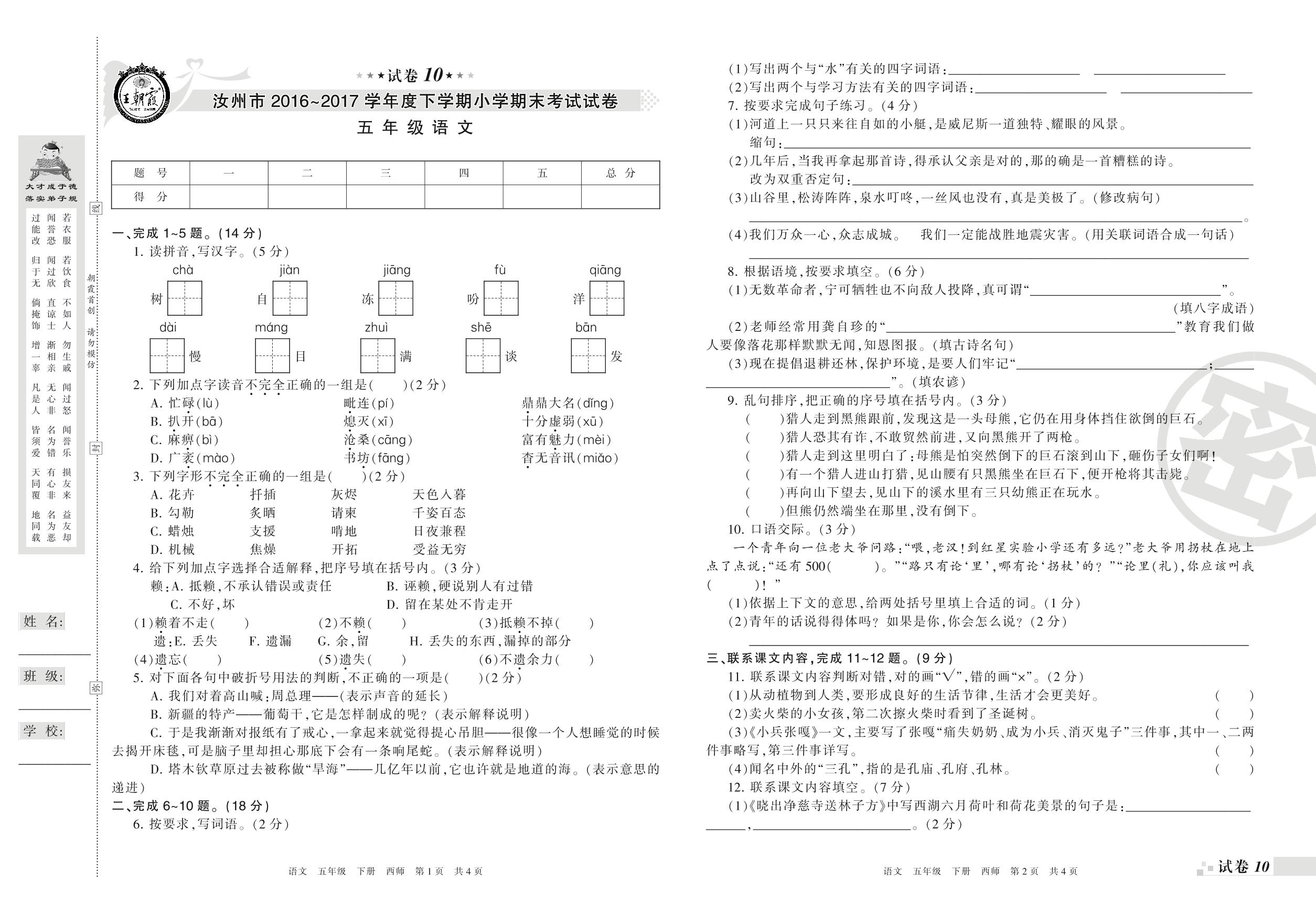 2016-2017学年第二学期汝州市五年级语文试卷(西师版)【10】