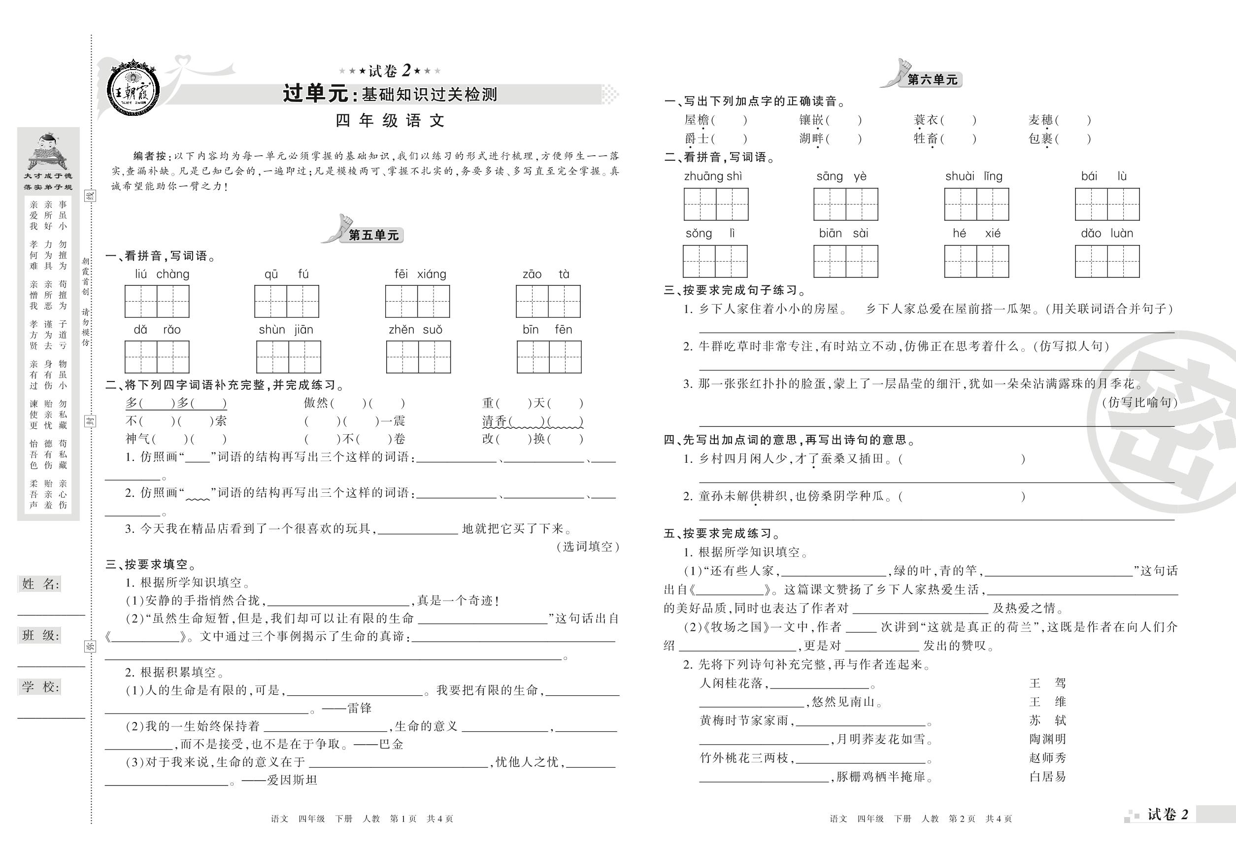 王朝霞期末过单元——基础知识过关检测四年级下册语文(人教版)_R210801225113【2】