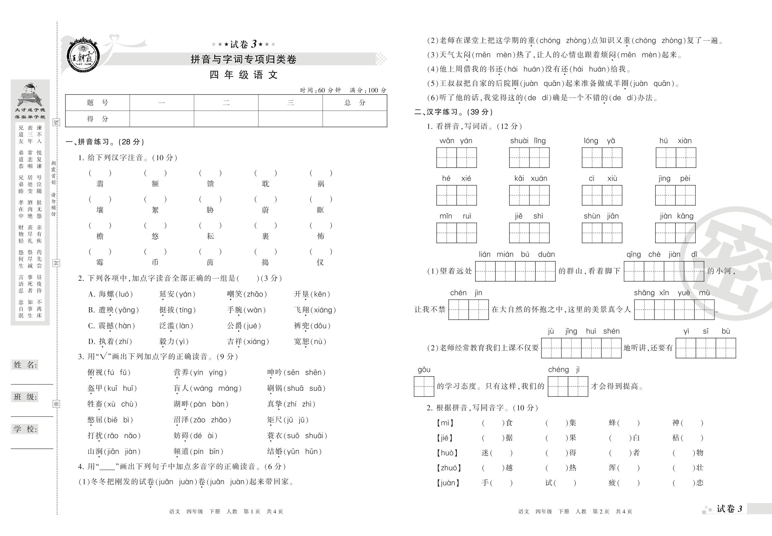 王朝霞期末专项卷——拼音与字词专项归类卷四年级下册语文(人教版)_R210801225116【3】