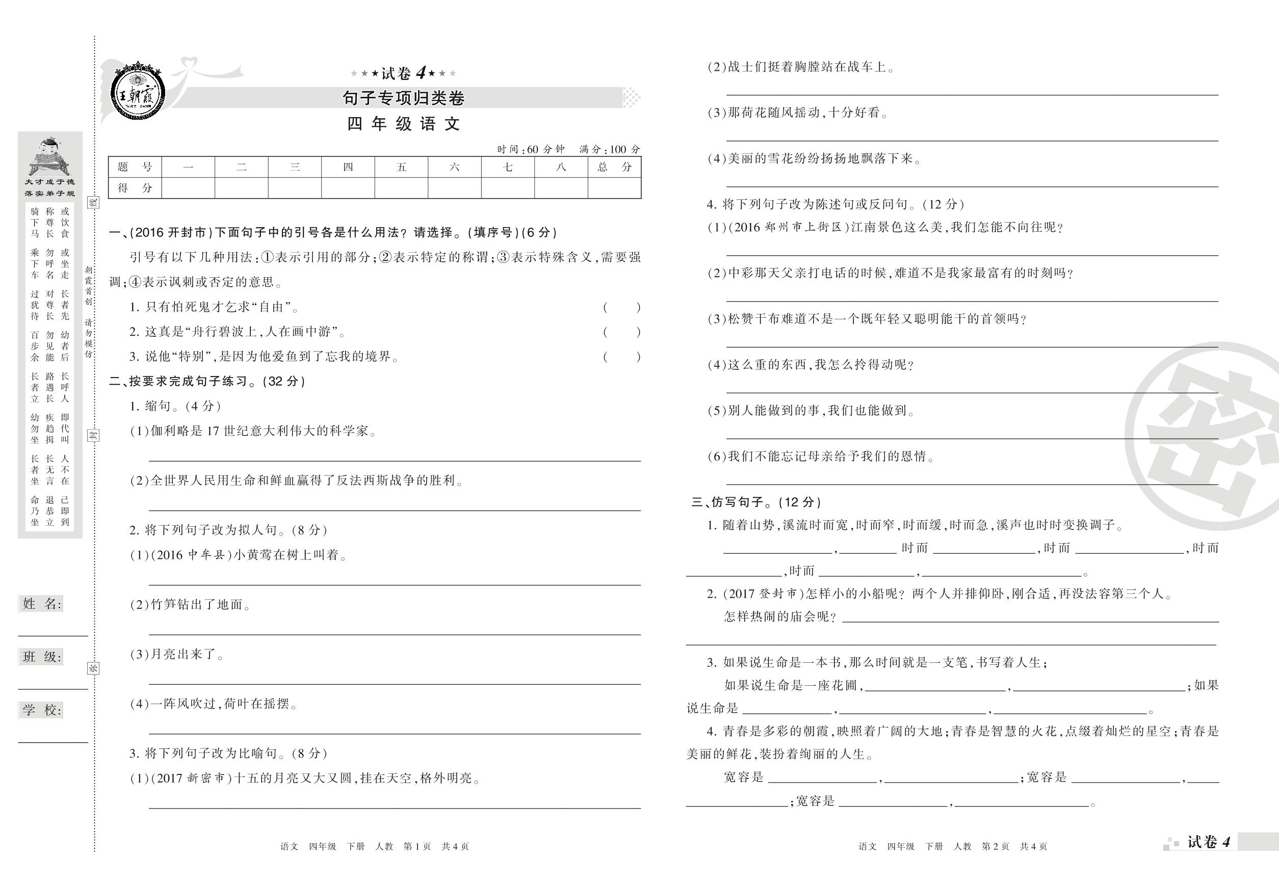 王朝霞期末专项卷——句子专项归类卷四年级下册语文(人教版)_R210801225118【4】