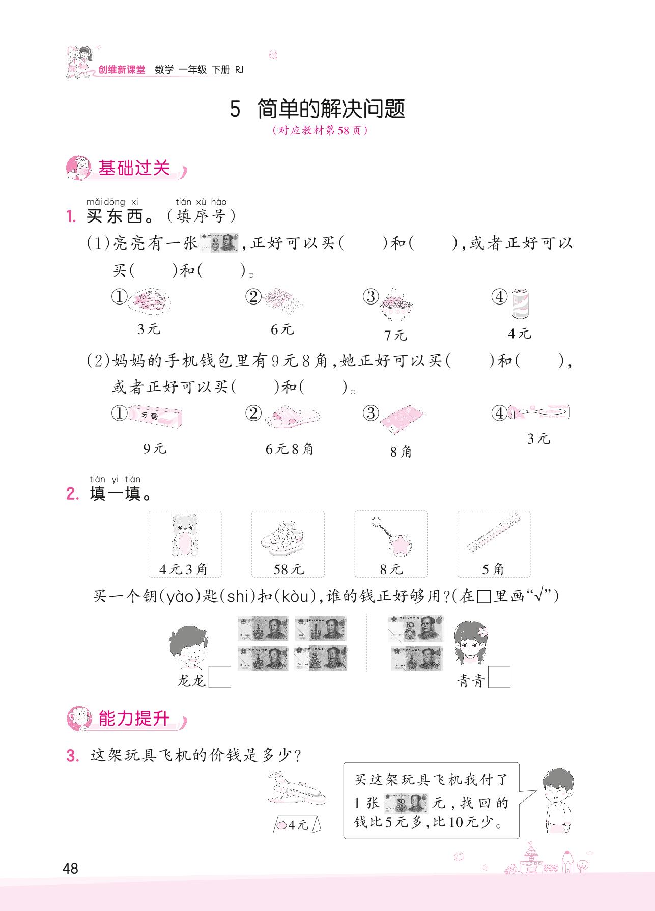 2022下册一年级数学人教版 五 认识人民币——5 简单的解决问题
