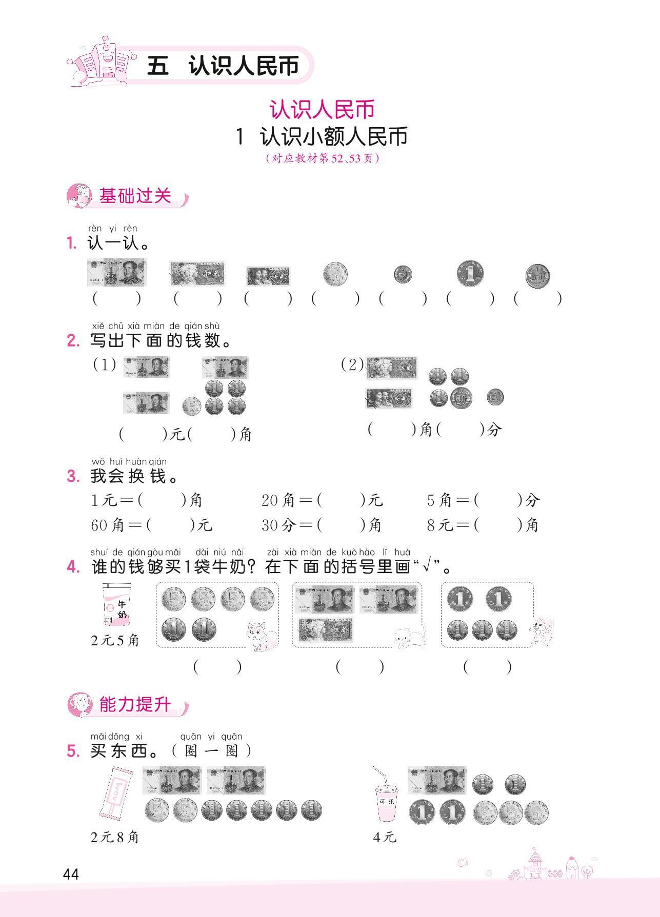 2022下册一年级数学人教版 五 认识人民币——1 认识小额人民币